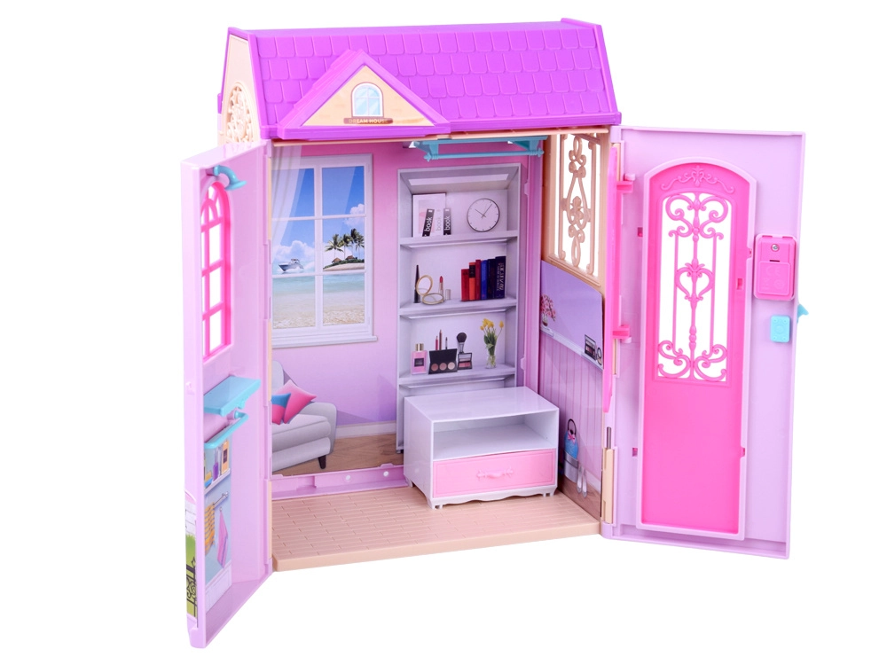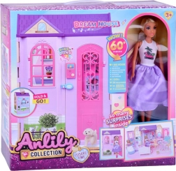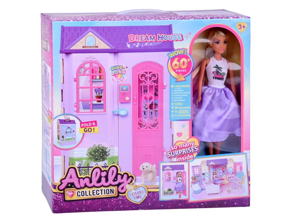 Prijenosna sklopiva kućica za lutke s bogatom opremom i lutkom ANLILY 30 cm pretvara svaki trenutak u maštovitu igru. Kućica se nakon otvaranja pretvara u tri prostorije – kupaonicu, spavaću sobu s toaletnim stolom i kuhinju. Zahvaljujući obliku kovčega s ručkom lako se prenosi, a sve se nakon igre može spremiti unutra. Ne nedostaju namještaj, odjeća, kuhinja, kupaonica ni preslatki kućni ljubimac. Zvono na vratima ima zvučnu funkciju na baterije.