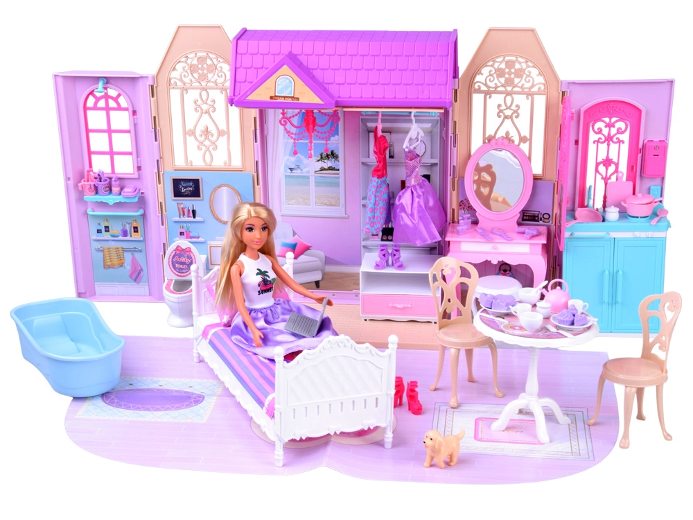 Sklopiva kućica‑kovčeg, lutka ANLILY, kada, WC, krevet s posteljinom, komoda s ladicama, vješalica za odjeću, toaletni stolić i stoličica, kuhinjski kut s umivaonikom i pločom za kuhanje, okrugli stol, 2 stolice, luster, figurica psića, pod (čvrsti plakat), 3 haljine, 2 para salonki, 2 vješalice, ručno zrcalo, češalj, fen, 2 bočice parfema, balzam, tuba kreme, 2 tube paste za zube, 2 četkice, sapun s posudicom, 2 čaše, laptop, lonac s poklopcem, tava, čajnik, 2 tanjura, 2 zdjelice, 2 šalice, 2 čašice, daska za rezanje, 2 seta pribora za jelo, kutlača, lopatica, nož, slatki kolačići