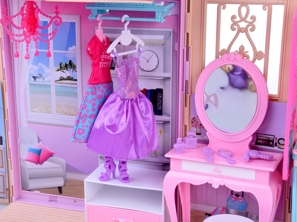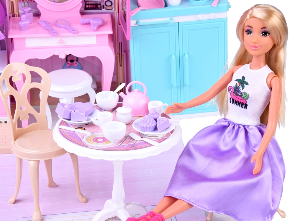Kupaonica, spavaća soba s toaletnim stolićem i kuhinja čine potpuni dom za lutku. Otvoriva vrata, prozori i detaljne dekoracije potiču maštu i realistično igranje.