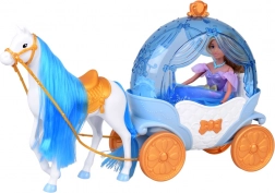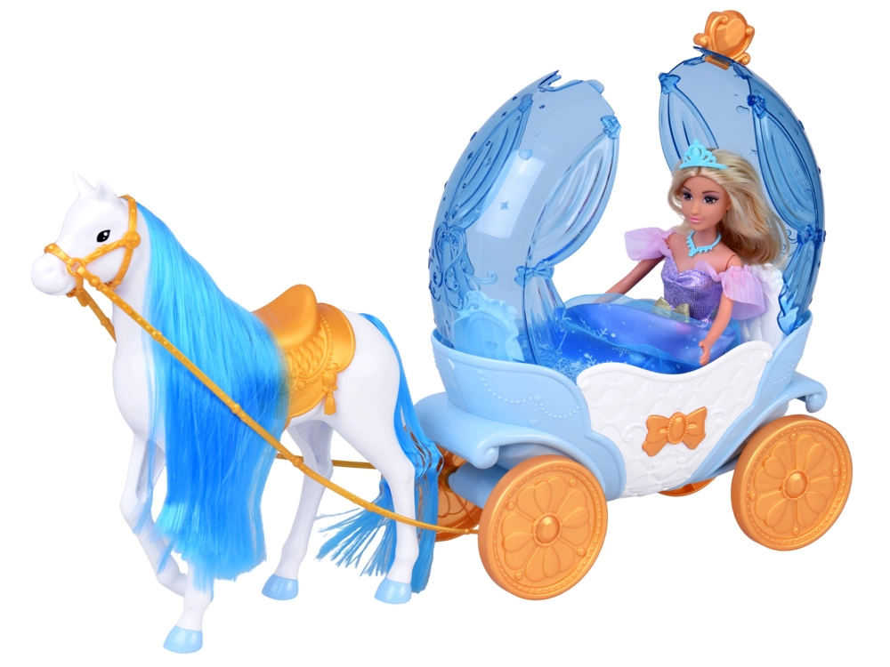 Bijeli konj s plavom grivom, sedlom i uzdom vuče kočiju. Idealan za igru kraljevskih putovanja i bajkovitih priča.