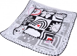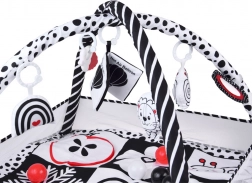 Kontrastni uzorci (crna, bijela, crvena) pomažu bebi bolje fokusirati pogled i potiču vizualni razvoj. Mekana površina podržava vrijeme na trbuščiću, podizanje glavice i jačanje vratnih i leđnih mišića – važni koraci prema okretanju, puzanju i hodu.