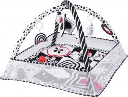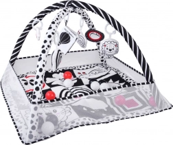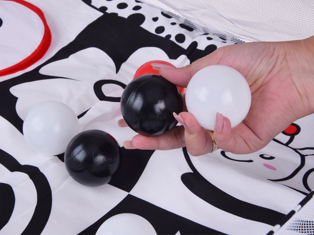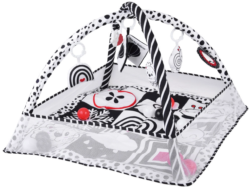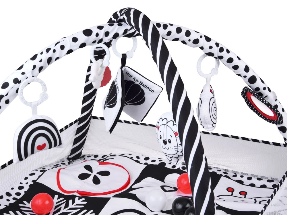Multifunkcionalna igraća podloga za bebe s kontrastnim crno‑bijelo‑crvenim dizajnom stimulira vid od prvih dana. Nudi viseće igračke, sigurne mrežaste rubove, zrcalce i set plastičnih loptica za dulju zabavu i razvoj motorike i koordinacije oko‑ruka.