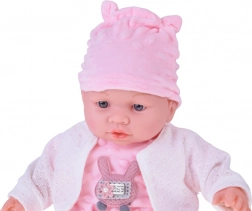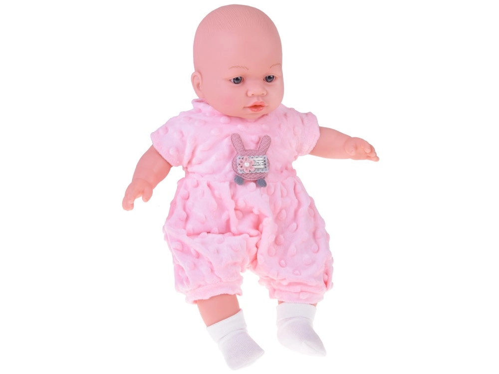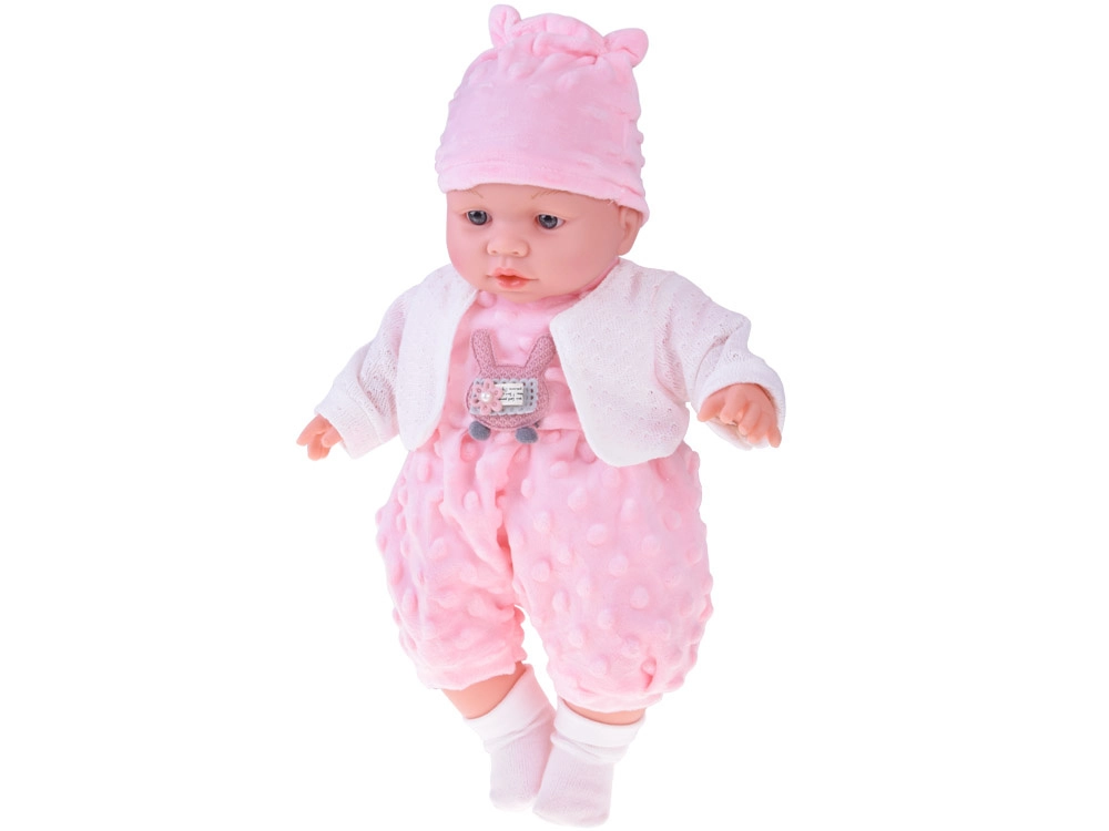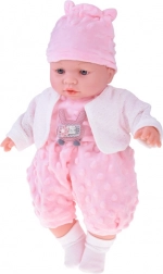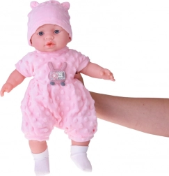 Preslatka beba visine 40 cm razveselit će svako dijete već od 12 mjeseci. Zahvaljujući mekanom tekstilnom tjelešcu odlično je za maženje, lagana je za nošenje i ima realistične detalje lica. Pritiskom na trbuščić ispušta različite zvukove – brblja, smije se, plačka i mrmlja. Dio seta je mekani ružičasti rampers od minky tkanine s aplikacijom, kapica s ušima, bijeli kardigan i čarapice.