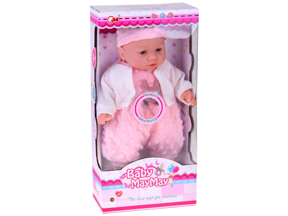 Zvučni modul skriven je u trbuščiću – nakon pritiska čuje se mješavina zvukova koje djeca vole: brbljanje, smijeh, mrmljanje i plač. Lutka nema kosu niti sitne dijelove, stoga je sigurna za najmlađe. U pakiranju je uključena baterija, dovoljno je samo ukloniti osigurač i igra može početi.