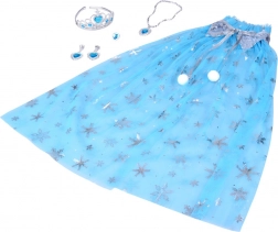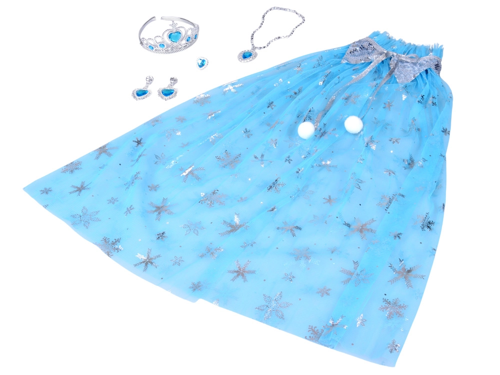 Pretvorite dječju maštu u zimsku bajku! Ovaj set za malu Snježnu kraljicu sadrži laganu plavu plašticu sa srebrnim pahuljicama i sjajnim detaljima te usklađene krunu, ogrlicu, prsten i kopčaste naušnice. Idealno za maškare, igre pretvaranja i tematske zabave.