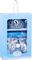 Dio seta je kompletan nakit: plastična kruna s plavim “draguljima”, ogrlica s privjeskom u obliku kapljice, upadljiv prsten i kopčaste naušnice sa srcolikim kamenčićima. Sve je lagano, udobno i prilagođeno dječjem presvlačenju.