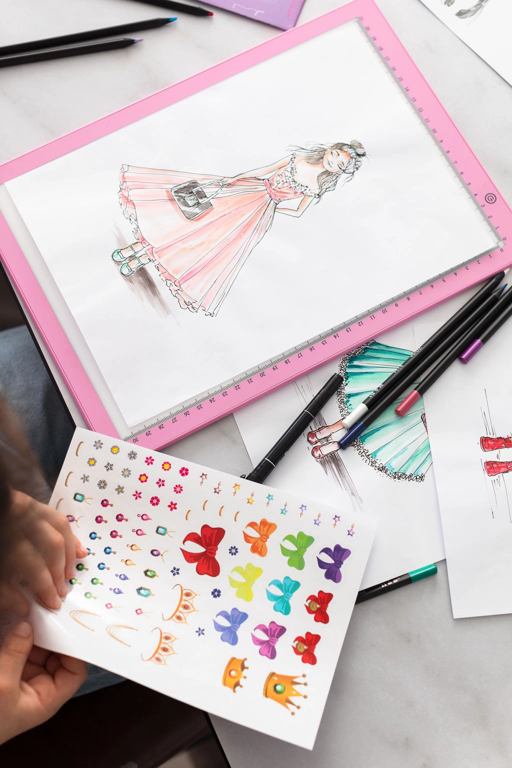 Stvorite vlastitu modnu kolekciju s kreativnim setom Artissimo za djecu od 10 godina. LED svjetlosna podloga A4 olakšava precrtavanje i slojevito crtanje, dok bogata oprema (šablone, siluete, papiri, flomasteri i drugo) potiče maštu i preciznost. Sjajan poklon za male dizajnerice i dizajnere koji žele dizajnirati trendi outfite poput pravih stilista.