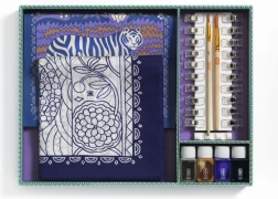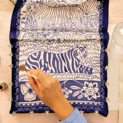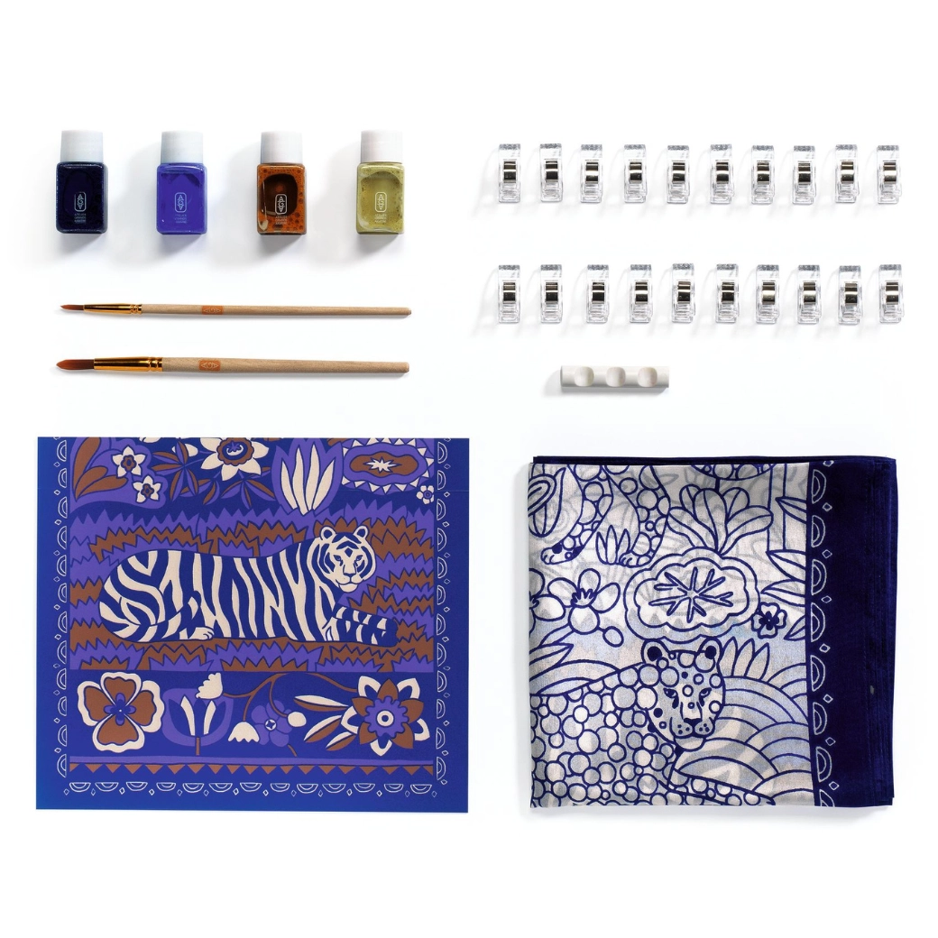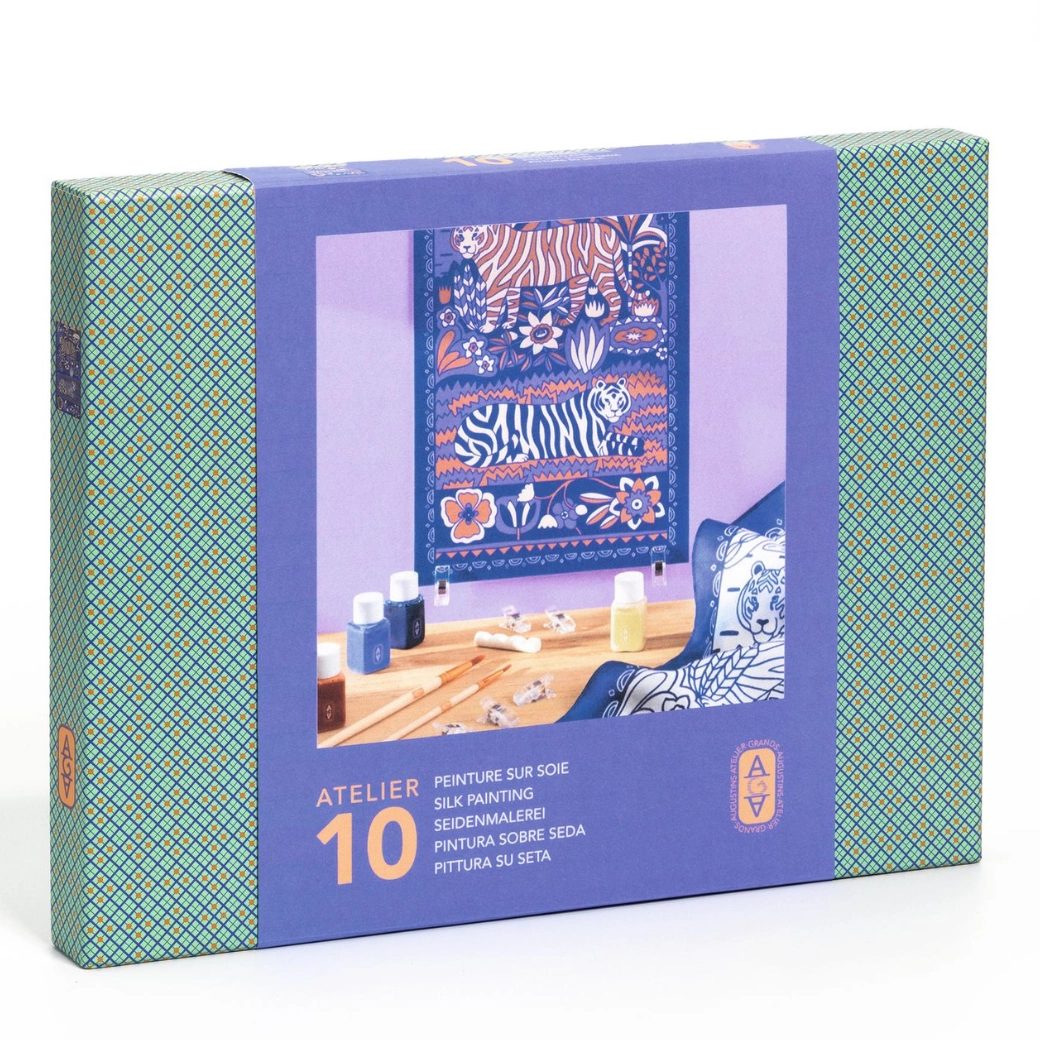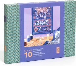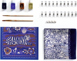 Set Slikanje na svili Atelier 10 od DJECO nudi sve što vam je potrebno za izradu prekrasnog, ručno oslikanog šala. Unaprijed otisnuti obrisi s motivom tigra i floralnih uzoraka vode kist i olakšavaju precizno bojanje, pa je projekt prikladan i za potpune početnike. Zahvaljujući kvalitetnim bojama za tekstil postižete zasićene nijanse i glatke prijelaze.