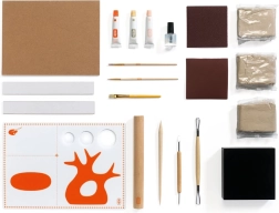 Organizirani set s valjkom, drvenim i petljastim alatima, kistovima, pigmentima, paletom i vrećicama s masom omogućuje vam neprekinut tijek rada od modeliranja do slikanja.
