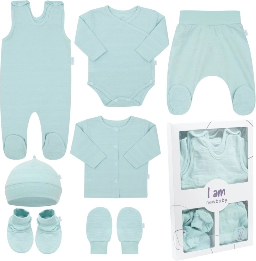Kompletan novorođenački set NEW BABY I AM u nježnoj mentol boji od mekane 100% pamuke za osjetljivu dječju kožu. Sadrži bodiji na drukere, zujalice (pahuljaste hlačice s nogavicama), poluzujalice, kaputić i kapicu. Jednostavno oblačenje zahvaljujući praktičnom kopčanju na drukere, a udobnost osiguravaju prozirni materijal i široki rubovi. Idealno za rodilište i za svakodnevno nošenje, a prekrasno je i kao poklon.