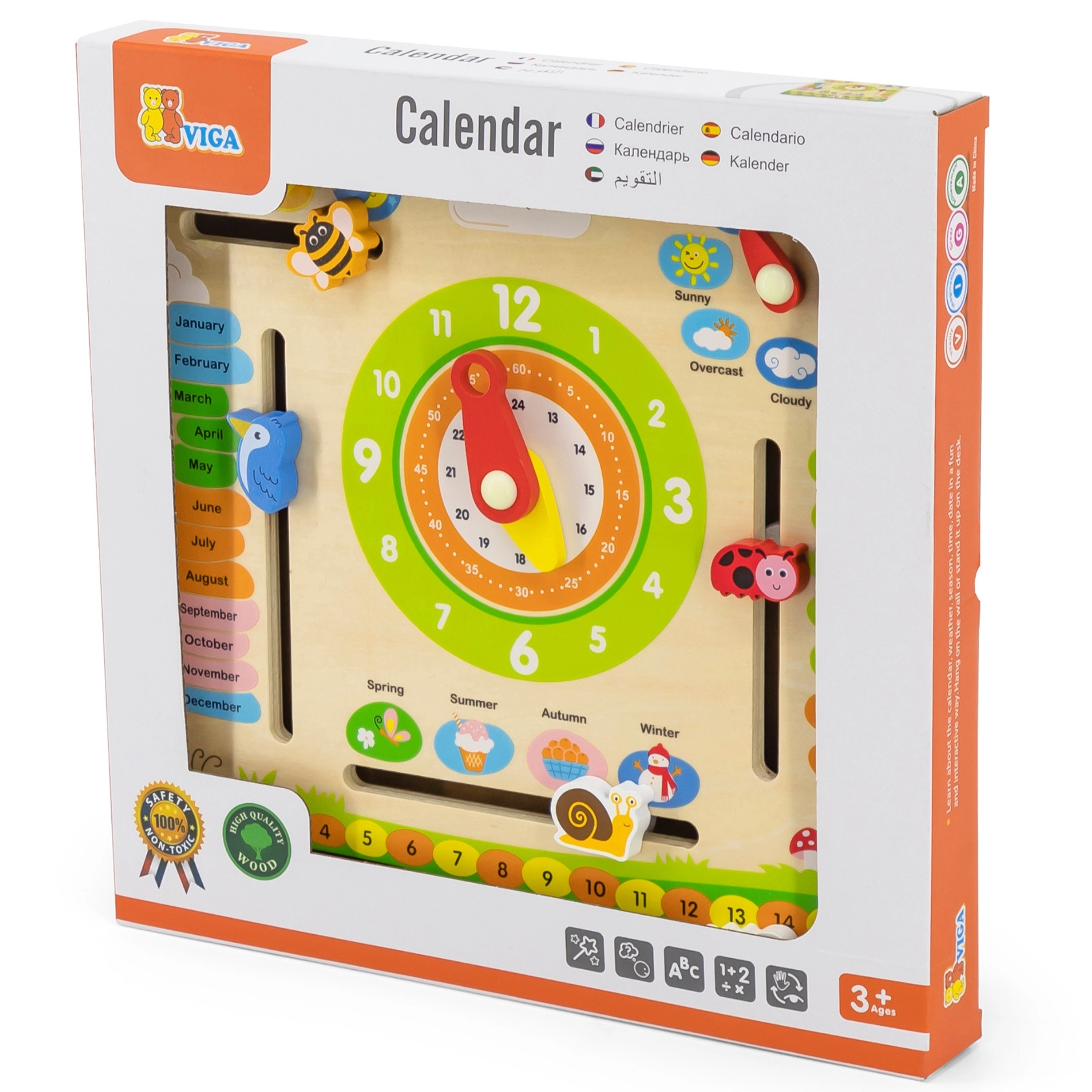 Edukativni kalendar VIGA je idealno pomagalo za djecu u učenju o vremenu, promjenama vremena i godišnjim dobima. Zahvaljujući šarenim i pokretnim elementima, pomaže svakodnevno razumjeti pojam vremena.