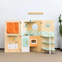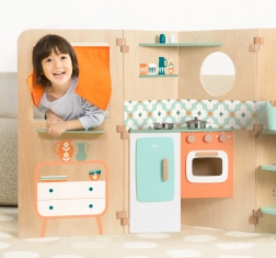 Kućica se jednostavno rasklapa u igraće zone i jednako lako sklapa u kompaktan oblik, stoga je idealna za manje sobe. Bogat set dodataka (lonci, šalice, pribor za jelo, sol i papar) potiče igru uloga, socijalne interakcije i razvoj vještina.