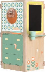 Ova drvena kućica nudi djeci beskrajne mogućnosti maštovite igre – od kuhanja u kuhinji, pranja u praonici pa sve do igranja kazališta iza prozorčića. Dio seta je i praktična ploča za crtanje i pisanje zadataka. Čvrsta izrada od kvalitetnih materijala jamči sigurnost i dug vijek trajanja.