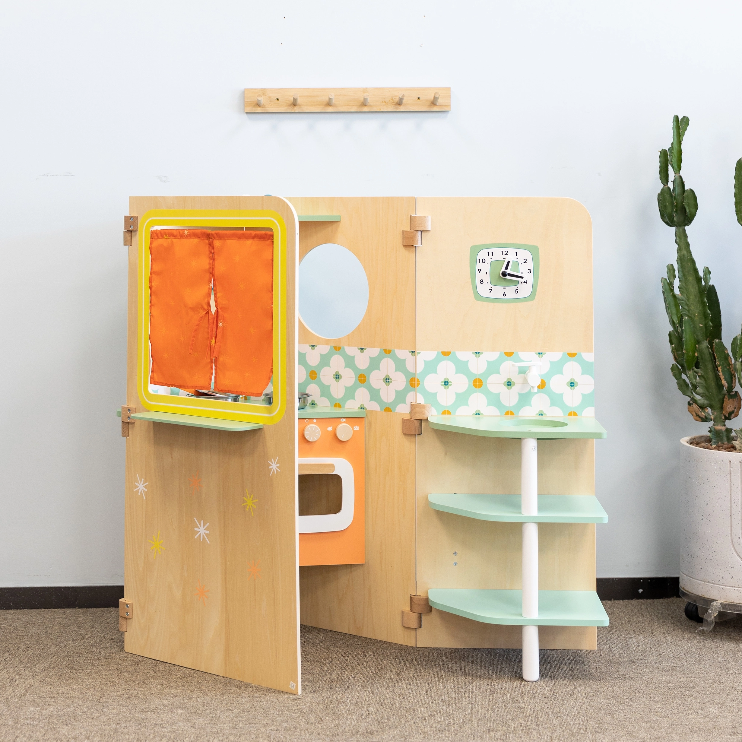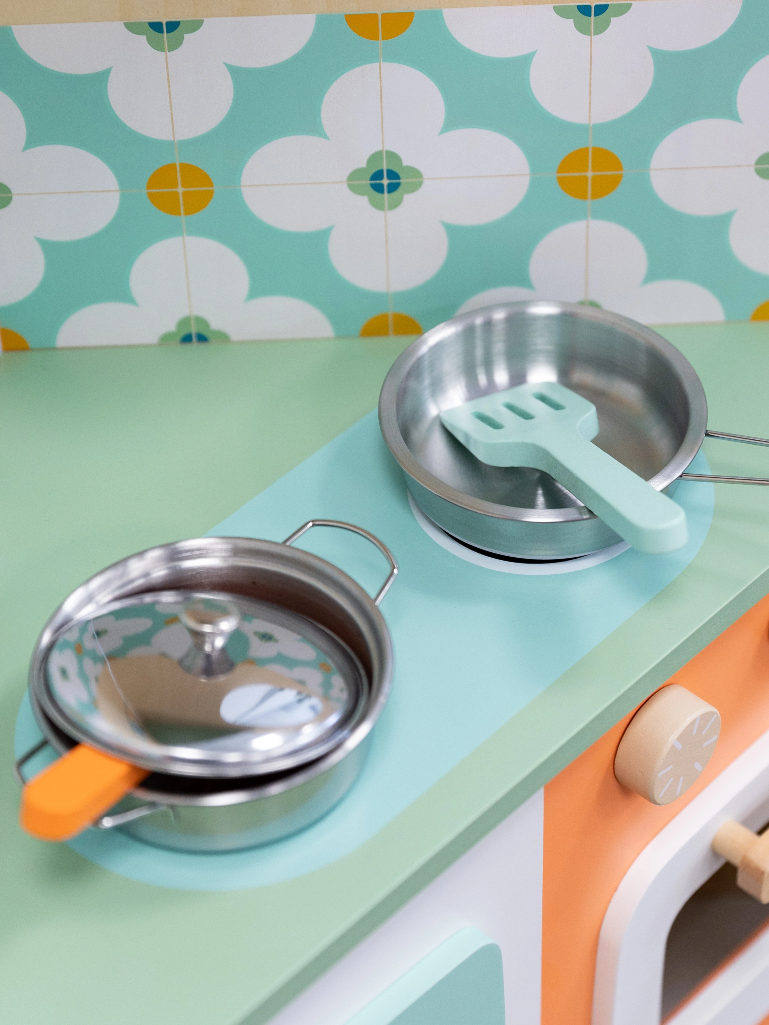 Djeca mogu “kuhati”, peći i posluživati kroz prozorčić. Vrata koja se otvaraju, okretni gumbi i police potiču realističnu igru i organizaciju dodataka.