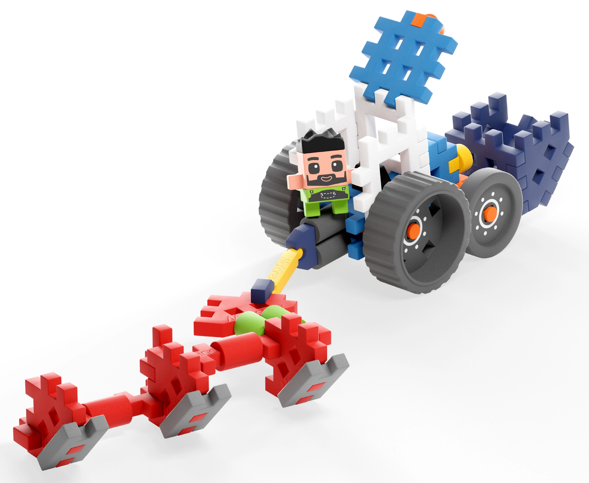 U kompletu je i figurica farmera koja obogaćuje doživljaj igre elementima role-playa. Djeca vježbaju kreativnost, manualnu spretnost i logičko razmišljanje dok uživaju u zabavi s traktorom na kotačima i priključivim plugom.