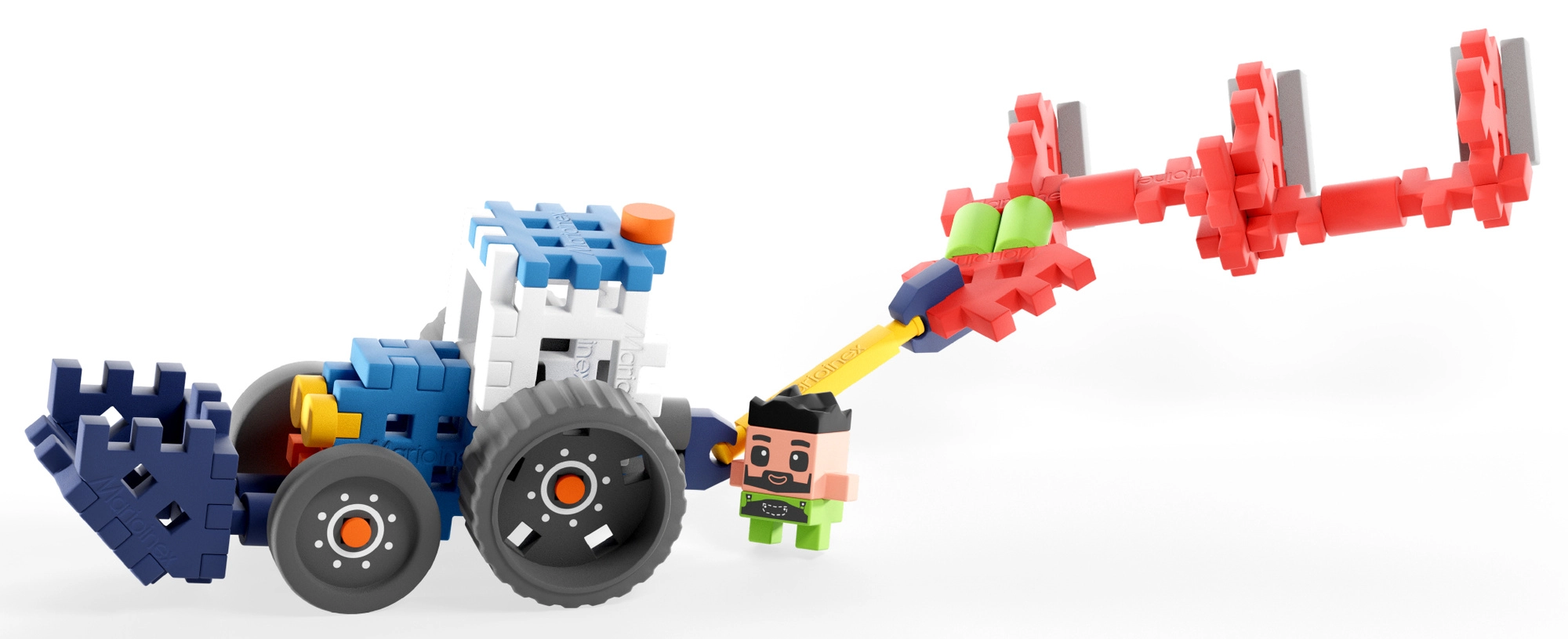 Od 50 šarenih i fleksibilnih dijelova lako ćete sastaviti traktor s prednjom lopatom i stražnjim plugom. Model je idealan za igru i ponovne pregradnje.
