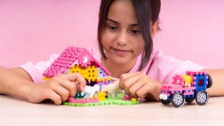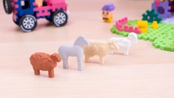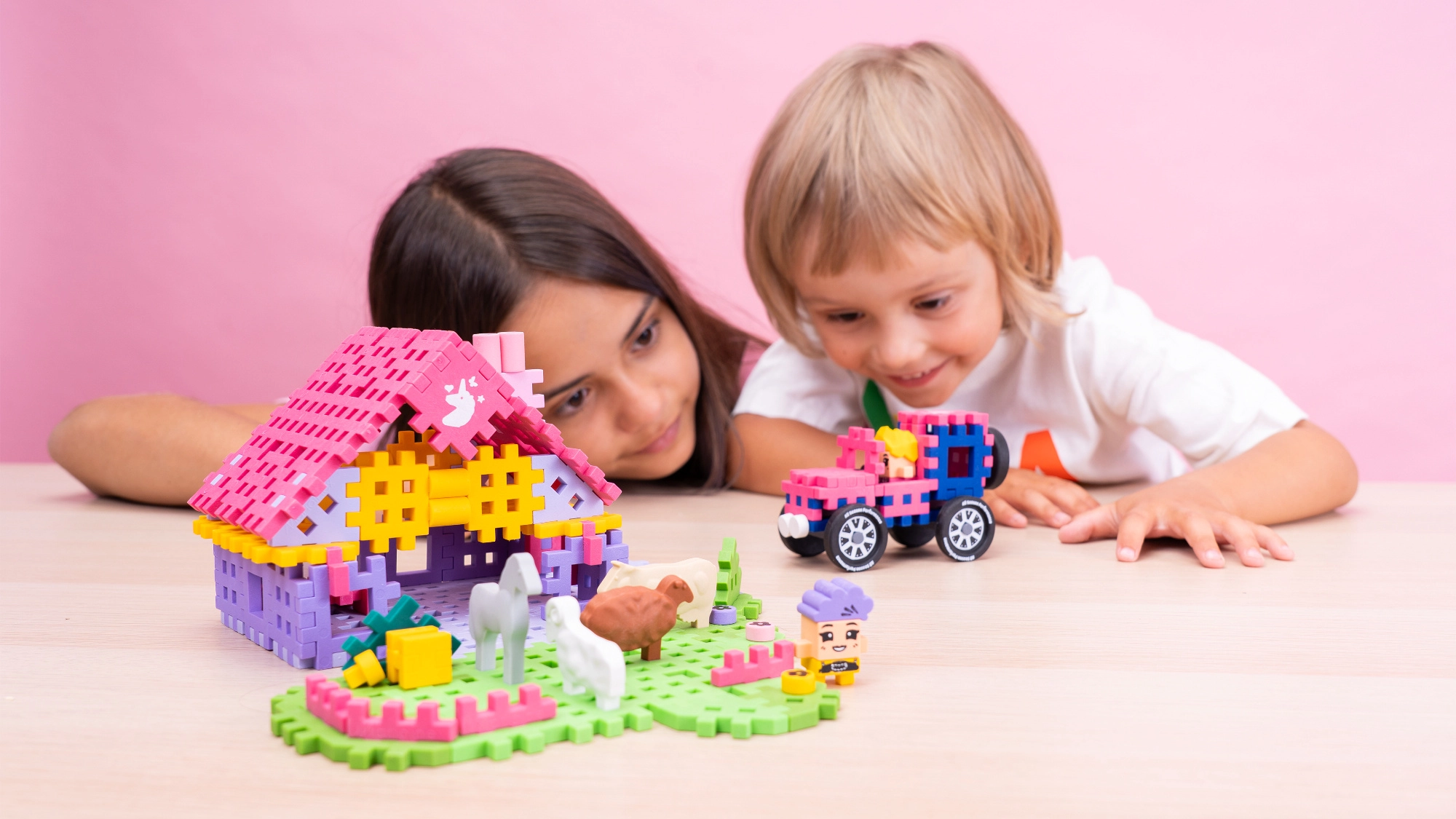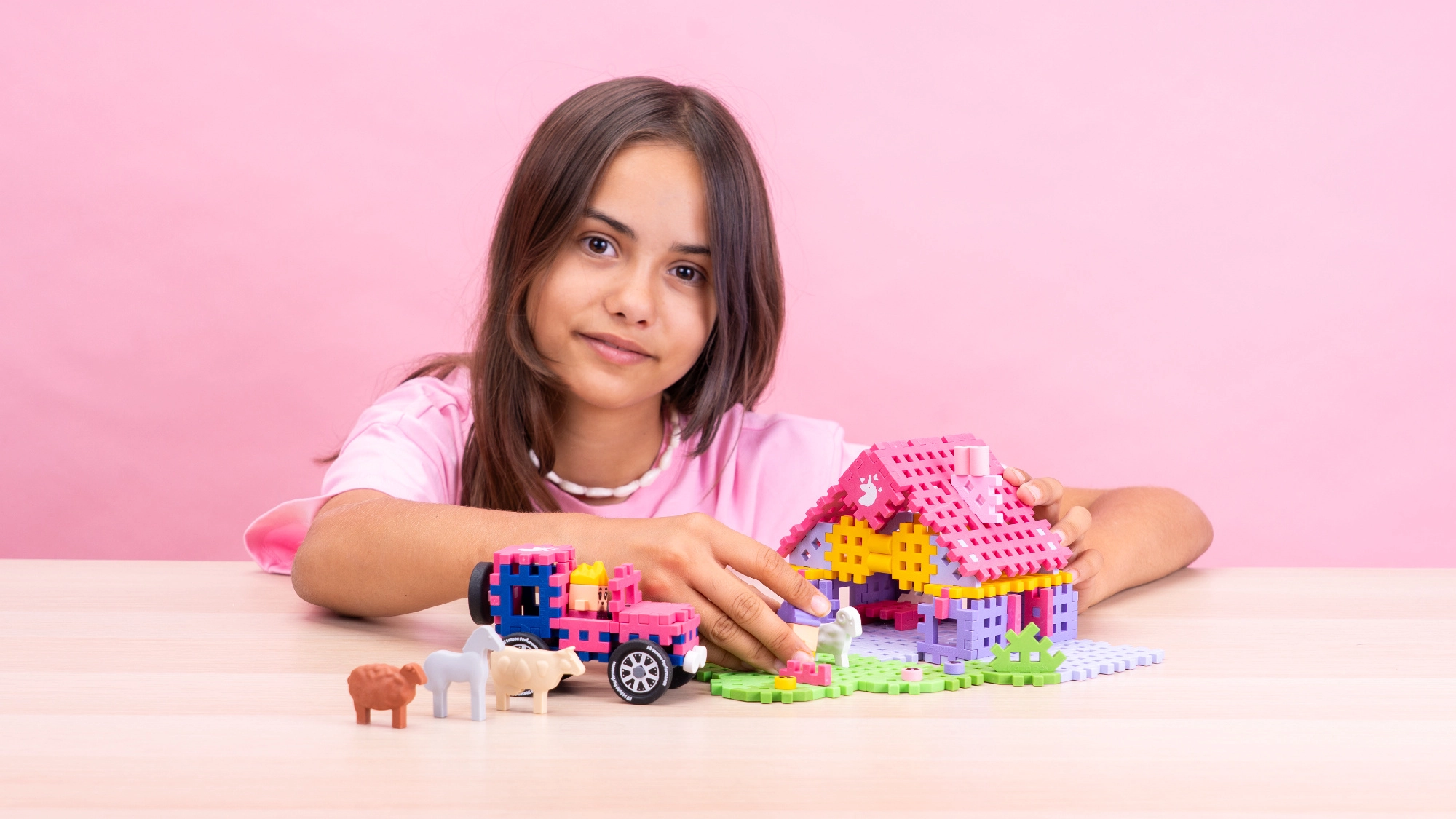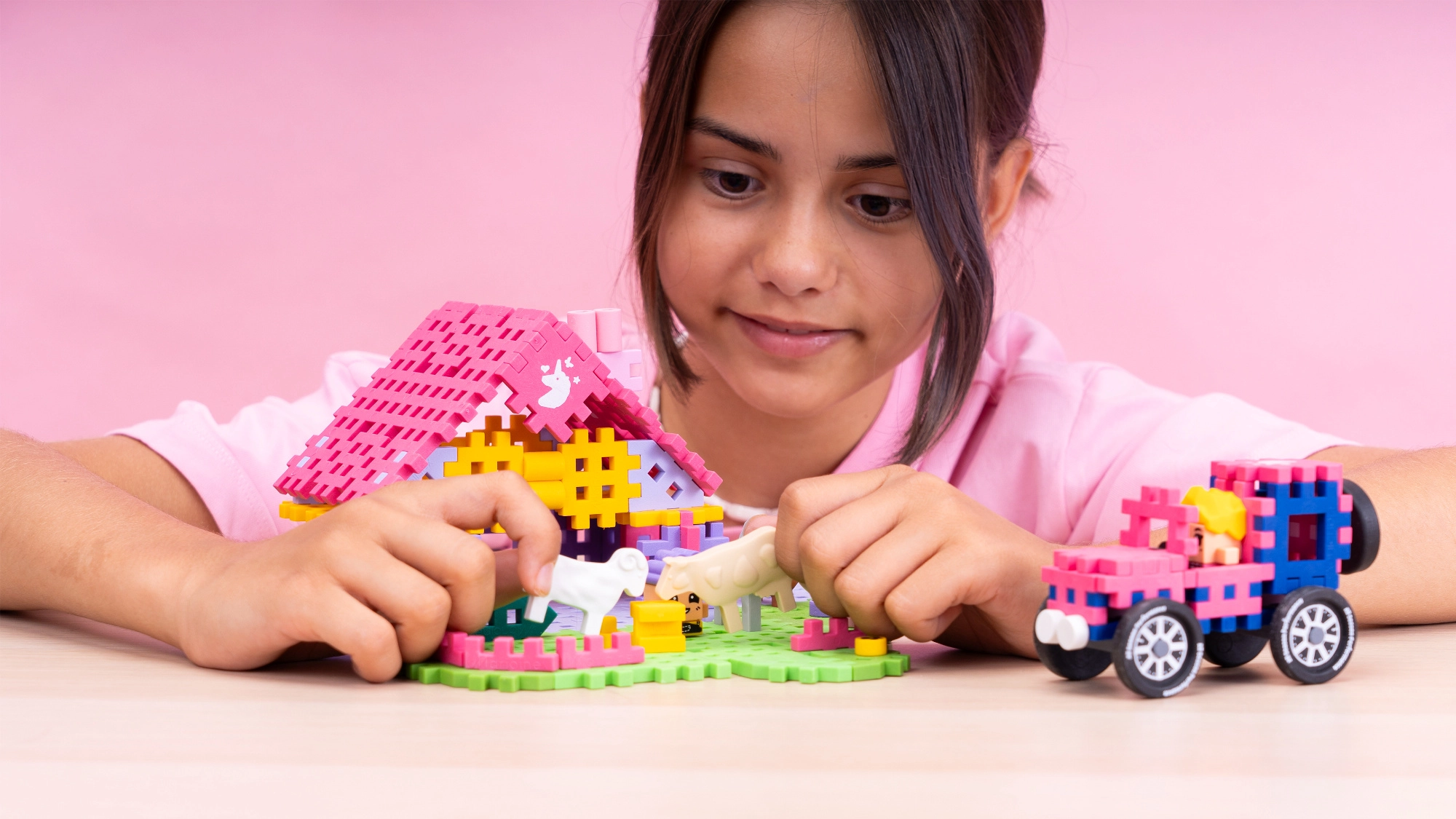 Kućica, ograde, životinje i detalji krajolika – sve od šarenih Mini Waffle dijelova koji potiču maštovitu igru i razvoj kreativnosti.