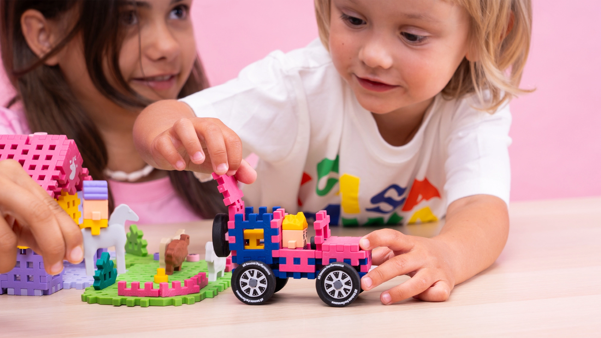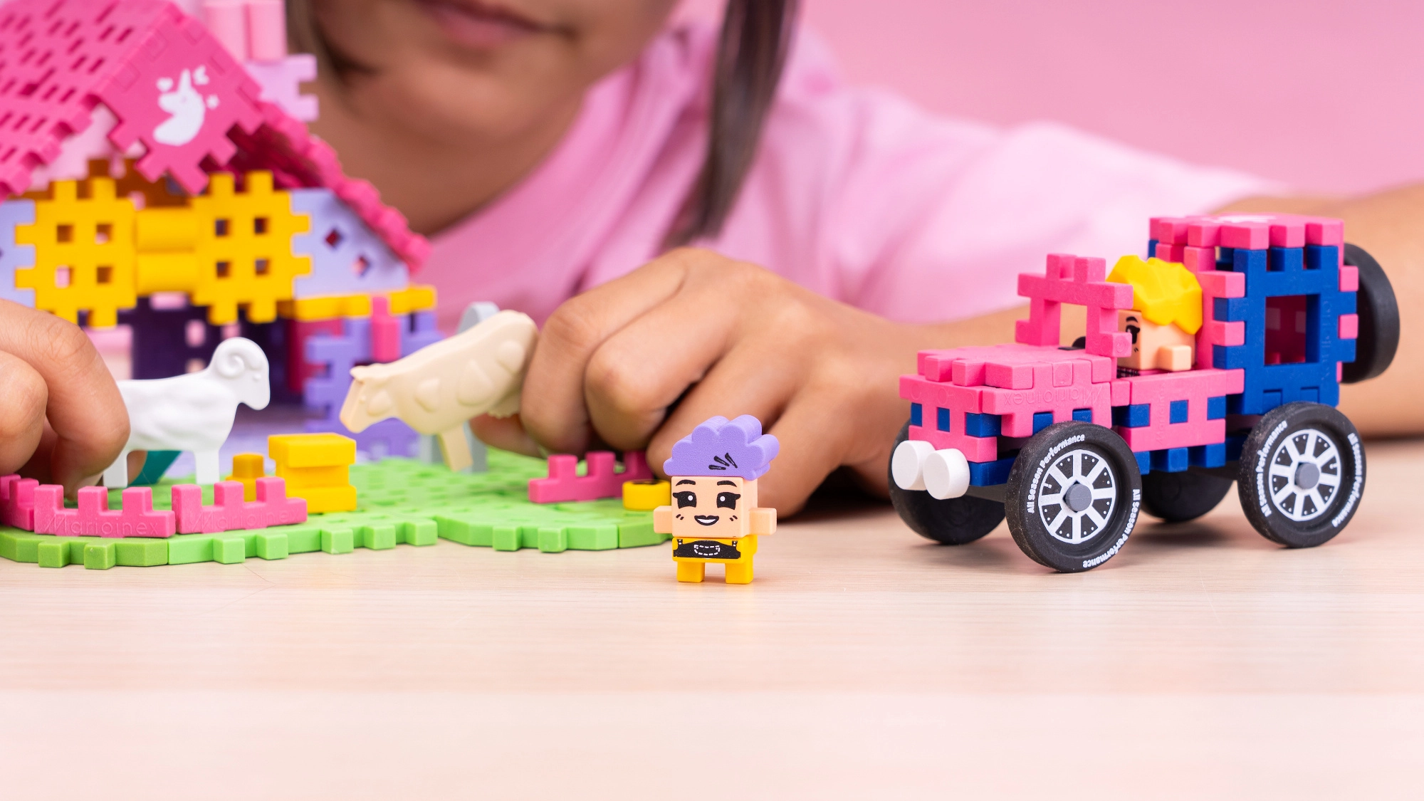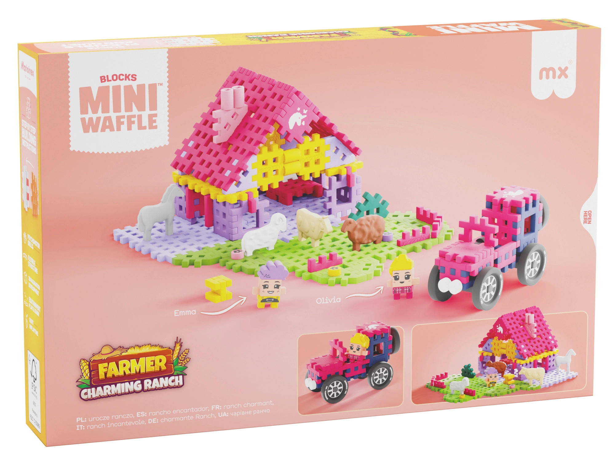 Ovaj set iz serije Mini Waffle donosi djeci mirnu farmersku priču punu životinja, kućice i malog vozila. Dijelovi su mekani, izdržljivi i sigurni, odlično se spajaju i ponovno razdvajaju, pa djeca iznova mogu stvarati nove građevine i scenarije.