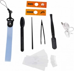 - Stabilna baza, odvojivi zaslon s mikroskopom, USB‑C kabel za punjenje, 2× uzorak (pačje pero, pamučno vlakno), 4× predmetno stakalce, 4× pokrovno stakalce, posudica za tekućinu, nastavak za epruvete, remen od tkanine, alati (skalpel, igla/šiljak, lopatica, pinceta), upute