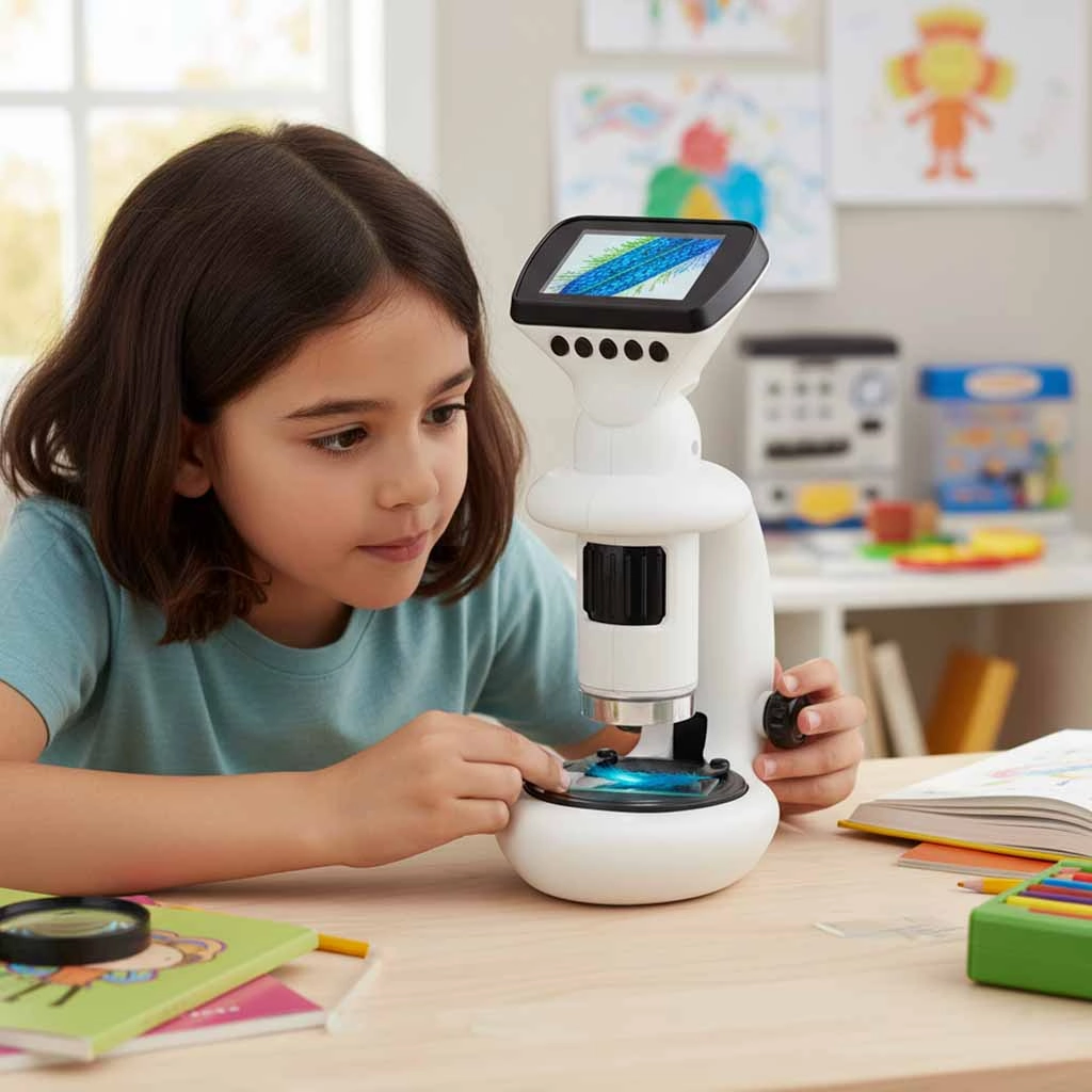 Otkrijte svijet mikrosvijeta s ovim digitalnim mikroskopom 3-u-1 s 2,4" LCD zaslonom, Wi‑Fi povezivanjem i povećanjem 200× do 1000×. Omogućuje fotografiranje i snimanje videa, nudi integrirano LED osvjetljenje i radi stolno i prijenosno – idealno za djecu od 6 godina, kućni laboratorij i STEM obrazovanje.