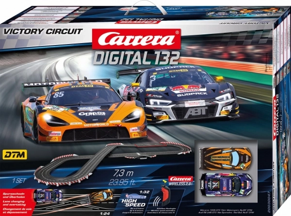Set Victory Circuit iz serije Digital 132 donosi vrhunski trkaći doživljaj u kućnim uvjetima. Zahvaljujući jedinstvenoj digitalnoj tehnologiji možete upravljati do 6 vozila na jednoj stazi, dinamično pretjecati i podešavati karakteristike pojedinih auta. Dva licencirana GT automobila – McLaren 720S GT3 i Audi R8 LMS GT3 – oduševit će detaljnom izradom i svjetlima.