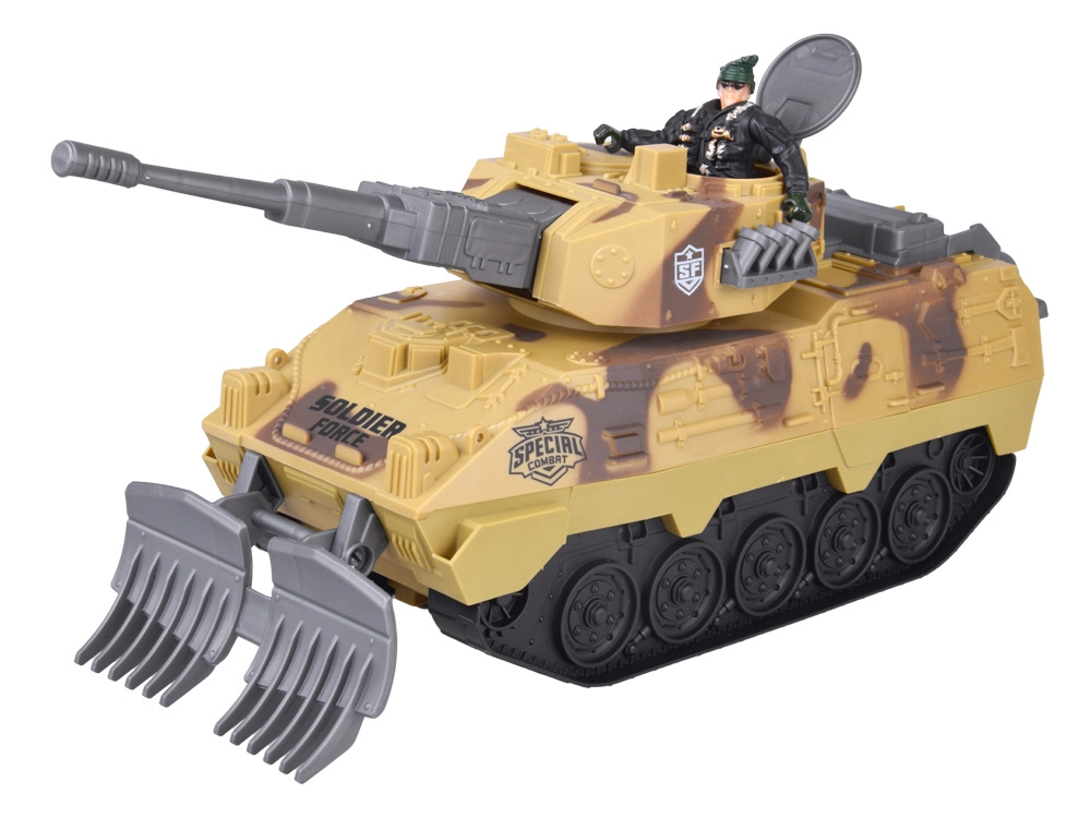 Detaljan tenk u pustinjskom maskiranju ima rotirajuću kupolu, podizni top, otvarajući poklopac za figuricu i prednju radlicu za “čišćenje” prepreka. Savršen za realistične manevre.
