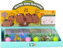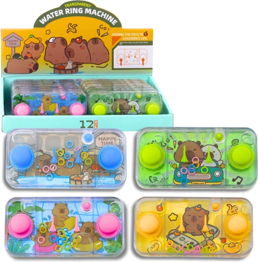 Otkrijte klasičnu vodenu igru koja zabavlja djecu već generacijama. Dovoljno je pritisnuti tipke, pokrenuti vodu i nastojati da šareni prstenovi slete na stošce unutar prozirnog spremnika. Vesele ilustracije s kapibarama i jarke boje osigurat će da joj se djeca rado vraćaju.