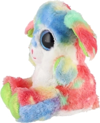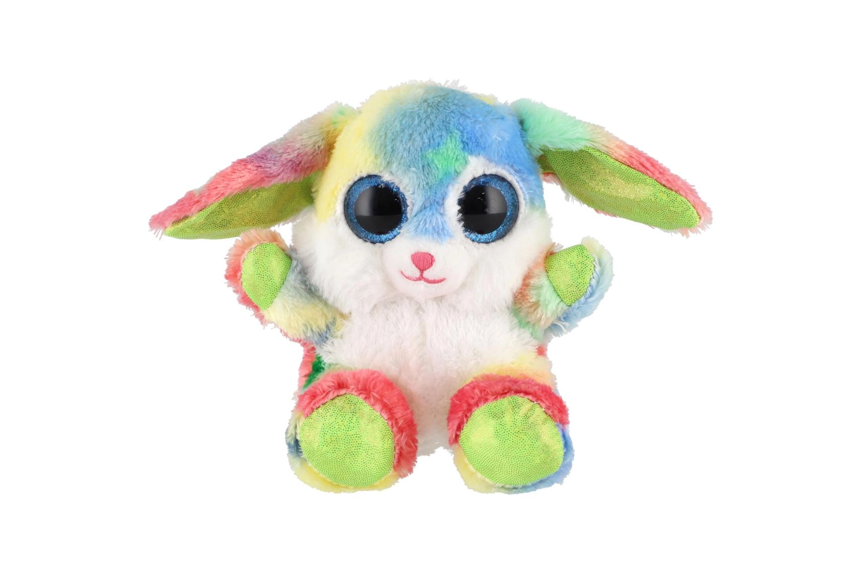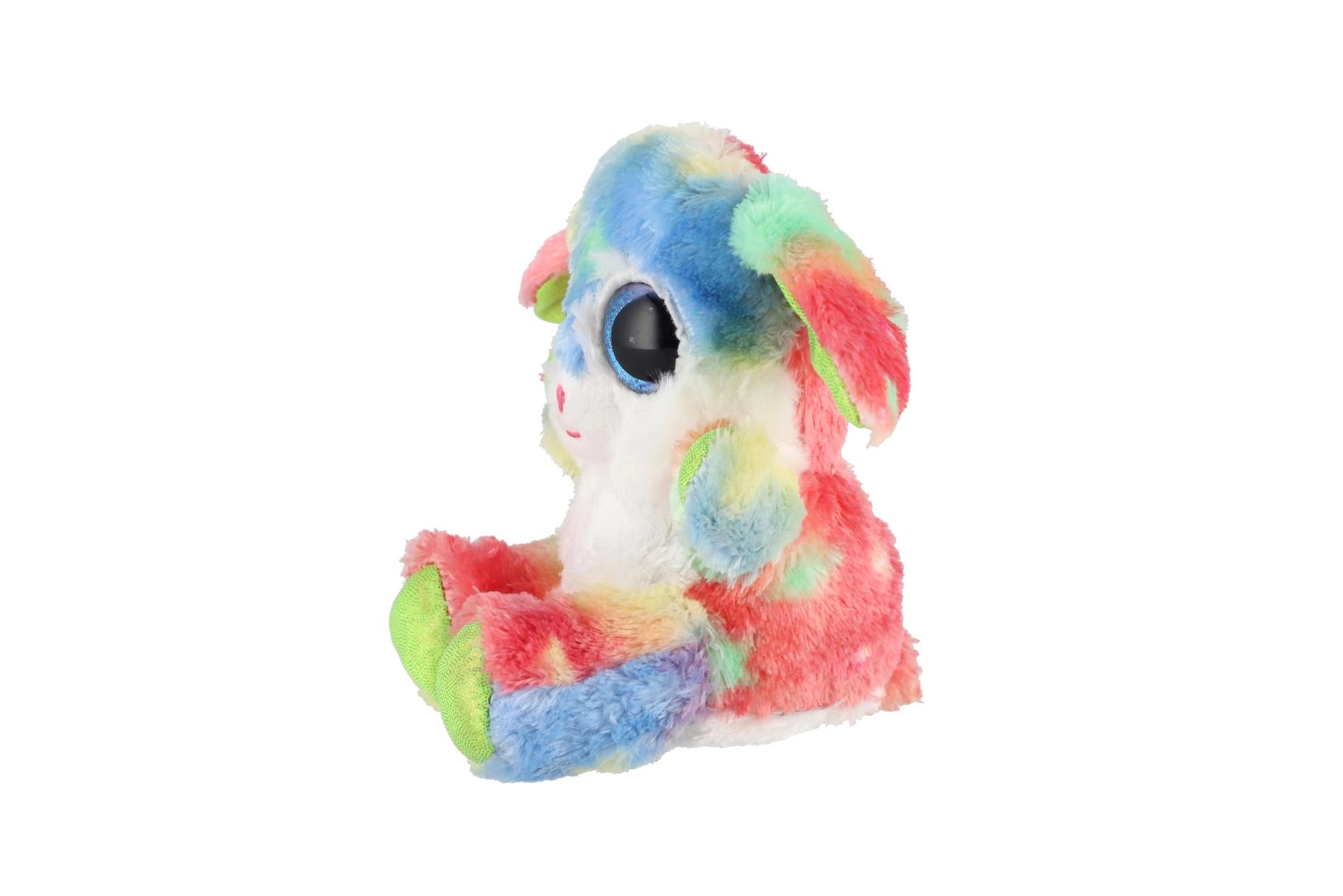 Preslatki sjedeći zečić u duginim bojama s velikim sjajnim očima idealan je mazilac za djecu. Izrađen je od ekstra mekanog pliša, ima duge savitljive uši i kompaktne dimenzije 15 cm za lako nošenje u krevetić, ruksak i na putovanja.