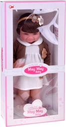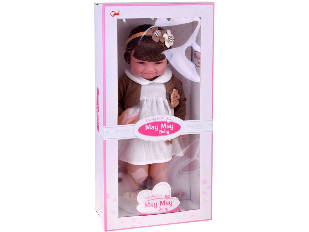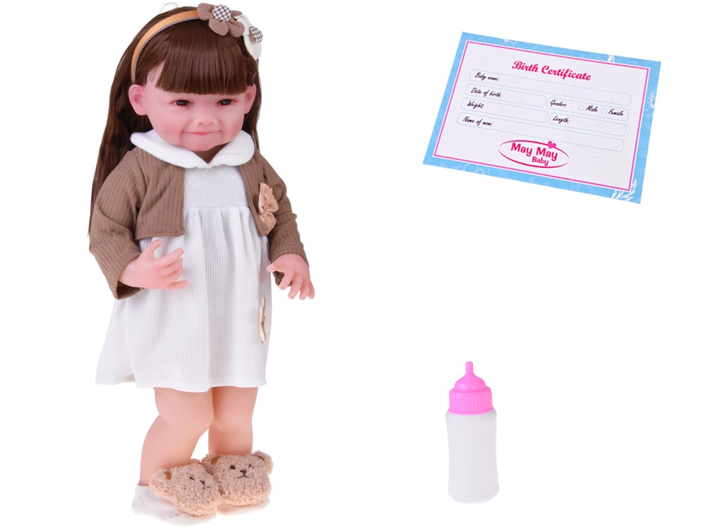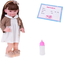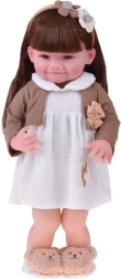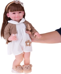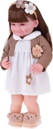 Ova prekrasna lutka odjevena je u bijelu haljinicu s cvjetnom aplikacijom i smeđi džemperić s mašnicom. Izgled upotpunjuju meke papučice u obliku medvjedića i bež obruč s ukrasom, koji naglašavaju nježan, dječje sladak stil. Zahvaljujući realističnom licu i dugoj kosi djeca će uživati u satima kreativne zabave.