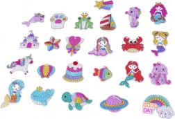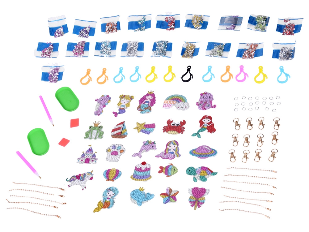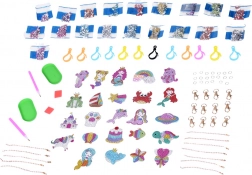 U setu ćete pronaći motive kao što su morske sirene, dupin, rak, morski konjić, kit s krunom, duga, planeta, dvorac, jednorog, torta, mačja šapa, školjka i drugi. Svaki privjesak ima predtiskana polja za kamenčiće, pa djeca lako shvaćaju gdje koji kamenčić postaviti. Dovoljno je nasuti kamenčiće u pladanj, pokupiti ih aplikatorom s voskom i pritisnuti.