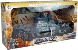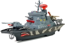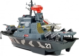 Ovaj detaljno izrađen vojni brod postat će središte svake dječje flote. Četiri funkcijska gumba pokreću različite kombinacije svjetala i zvukova – od šuma mora preko pucnjeva i uzbuna do glasa kapetana na engleskom. Rotirajući radar sa svjetlom i pokretna naoružanja na pramcu pojačavaju doživljaj igre.