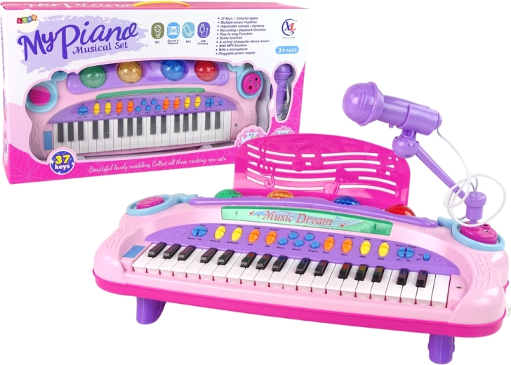 Ružičasta dječja klavijatura s 37 tipki, svjetlosnim efektima i mikrofonom za pjevanje i sviranje. Nudi snimanje i reprodukciju, USB/MP3 ulaz, demo skladbe i regulaciju glasnoće – idealno za razvoj glazbenog sluha i ritma djece od 3 godine.