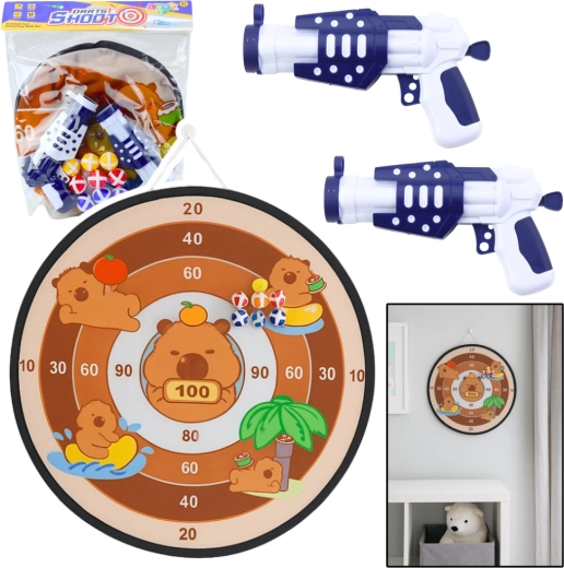 Velik format mete s atraktivnim tiskom kapibara lako se objesi na zid pomoću kukice s vakumskom čašicom. Dva pištolja u pakiranju omogućuju poštene dvoboje jedan na jedan – odlično za obitelji i dječja druženja. Igra ne zahtijeva baterije, pa je uvijek spremna za akciju.