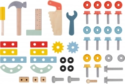 Zahvaljujući gumenim trakama na kotačima vožnja je tiha i nježna prema podu. Ergonomska ručka dobro leži u dječjoj ruci, a stražnja kutija za alat prima sve dijelove. U kompletu je bogat set drvenih alata i spojnog materijala za beskrajne varijacije konstrukcija.