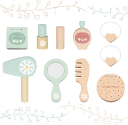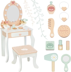 Dio pakiranja je široka paleta drvenih dodataka – od “kozmetike” do češlja i sušila za kosu – koji nisu pravi kozmetički pripravci, stoga su prikladni i sigurni za igru. Toaletni stolić potiče finu motoriku, samostalnost, logičko razmišljanje i maštu.