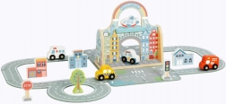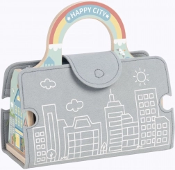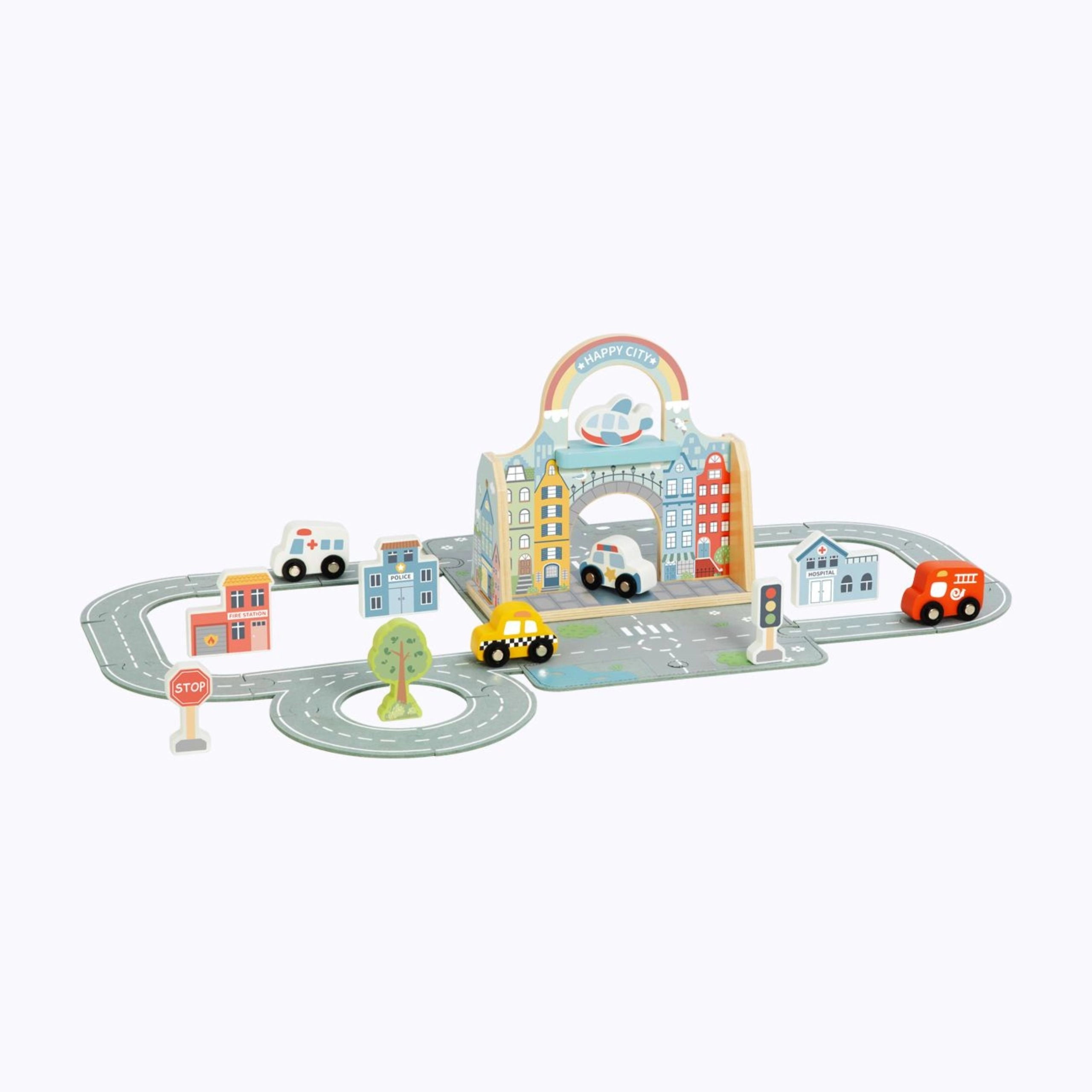 Ovaj kreativni drveni set pretvara svaki stol u užurbani grad. Ceste od filca lako se slažu u različite rute, mali autić prolazi kroz gradska vrata, pokraj semafora i prometnih znakova. Prijenosna konstrukcija u obliku torbe omogućuje da cijeli grad ponesete na put – kuci djedovima i bakama ili na odmor.