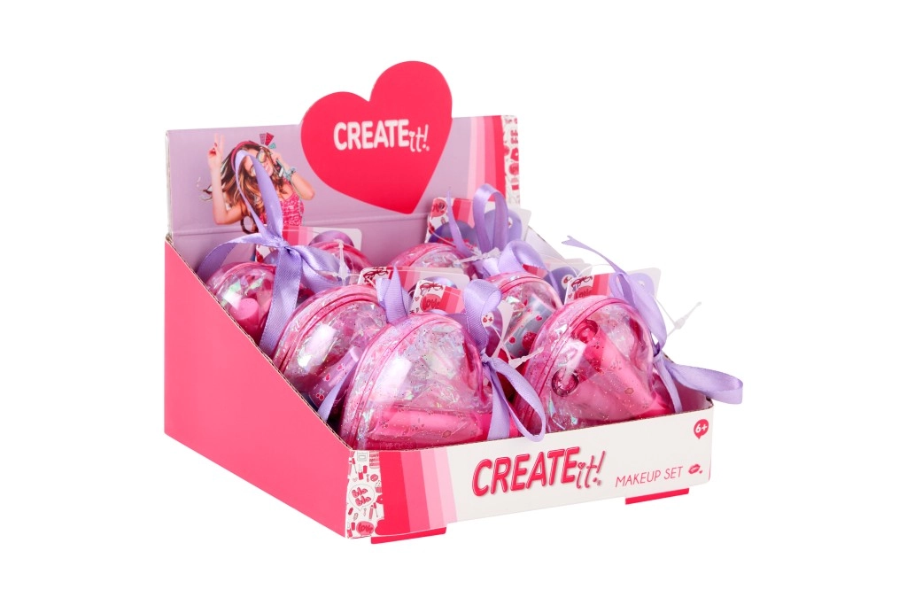 Otkrijte čaroliju šminkanja za djecu uz set CREATE IT! u slatkom srcolikom etuiju. Prozirna ružičasta ambalaža sa šljokicama i praktičnom vrpcom omogućuje sigurno čuvanje kozmetike i lako stane u ruksak ili torbicu. Svaki set osmišljen je za radost kreativnosti i jednostavno korištenje.