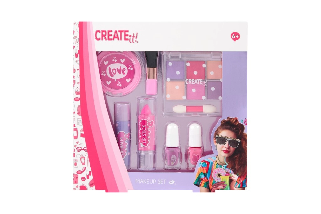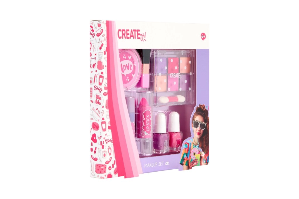 Otkrijte razigranu i sigurnu zabavu sa stilskim dječjim setom šminke CREATE IT! Pink Turquoise. Ovaj šareni kozmetički set za male ljubiteljice mode od 6 godina sadrži sve što je potrebno za kreativno šminkanje i styling noktiju: 6 svjetlucavih sjenila za oči, 2 laka za nokte, krijona za kosu, balzam za usne, ruž, velika četkica i mali dvostrani aplikator.
