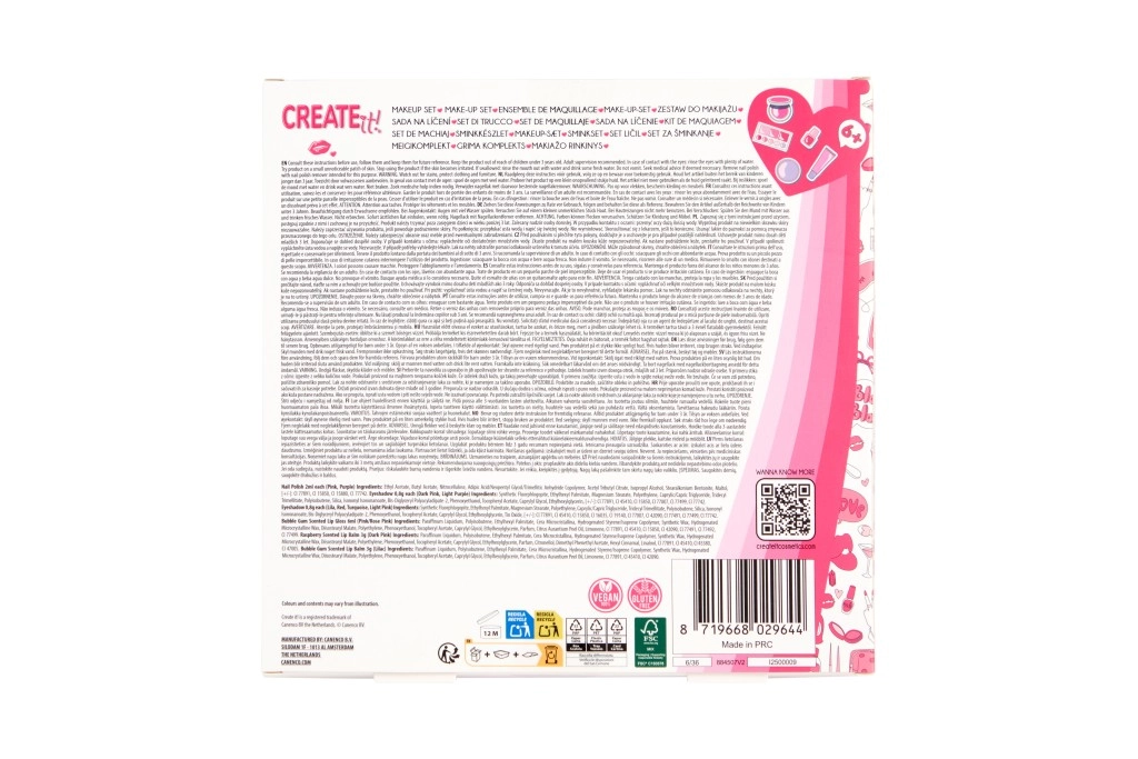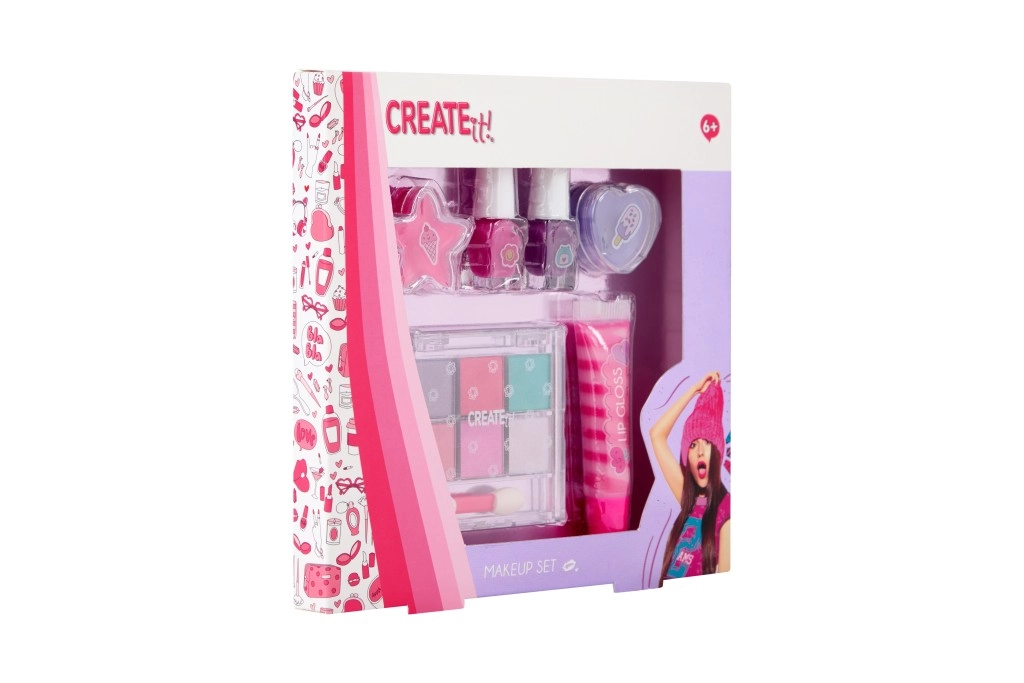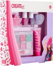 Zabavan dječji set za šminkanje CREATE IT! u bojama lila i tirkiz razveselit će male šminkerice od 6 godina. Sadrži sve za kreativnu igru: 2 laka za nokte, balzam za usne, ruž, paletu s 6 svjetlucavih sjenila za oči, krijonu za kosu i kistove za jednostavnu aplikaciju.