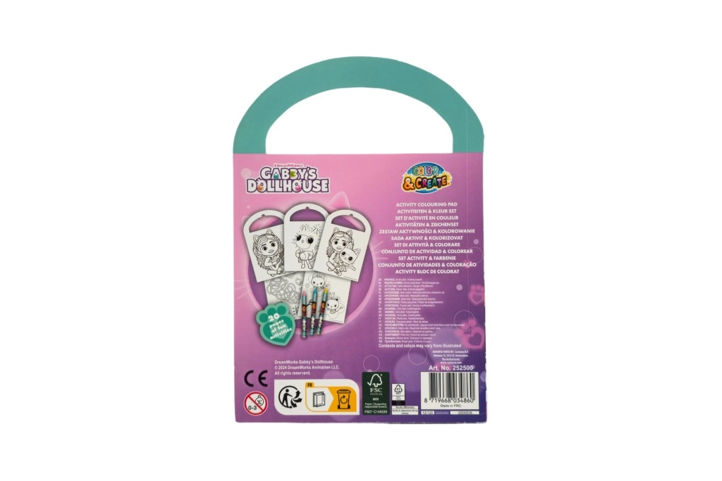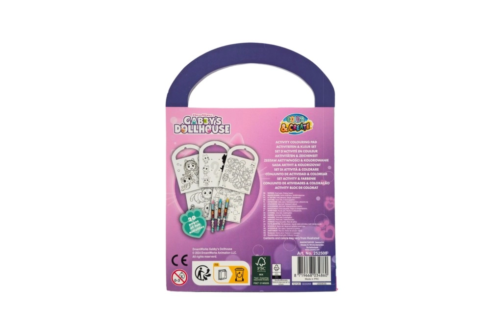 Zabavna kreativna bilježnica prepuna bojanki, zadataka i zagonetki s motivima serije GABBY’S DOLLHOUSE. Zahvaljujući praktičnoj ručki idealna je za putovanja i sadrži 3 voštane boje za trenutačno stvaranje. Razvija kreativnost, finu motoriku i logičko razmišljanje djece od 3 godine.