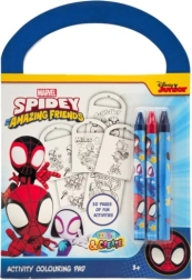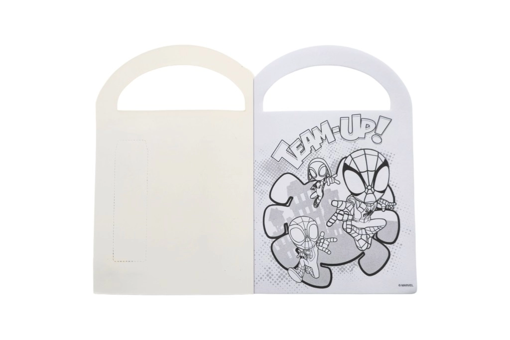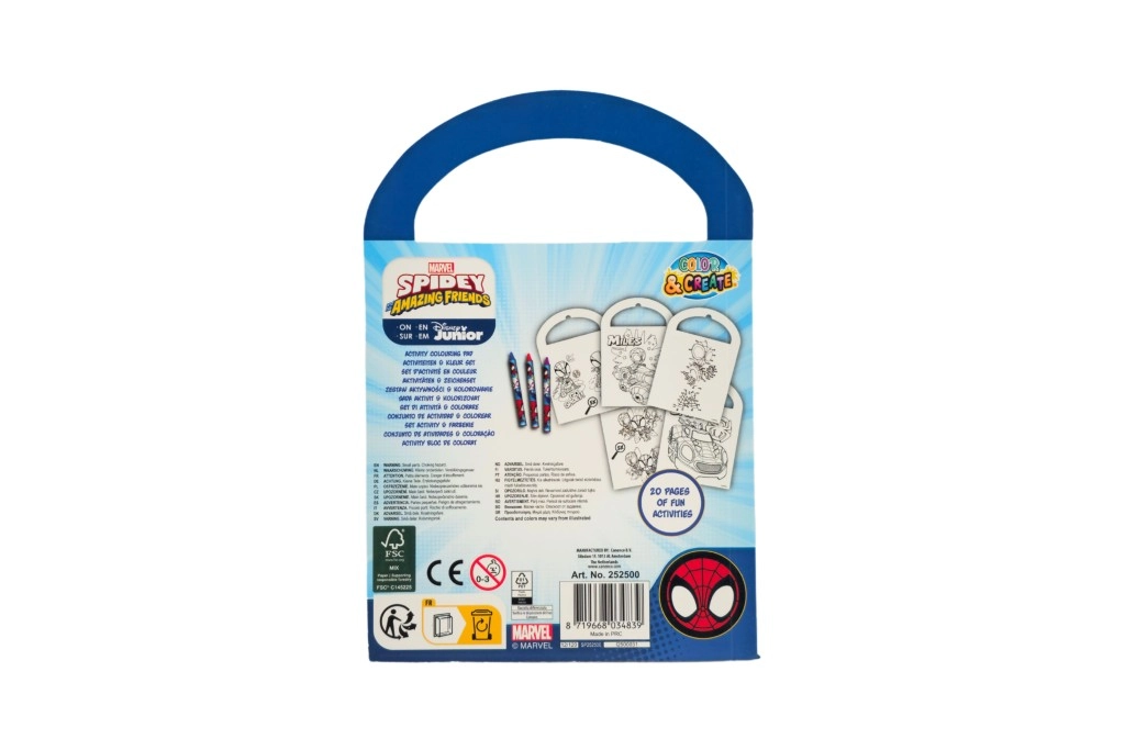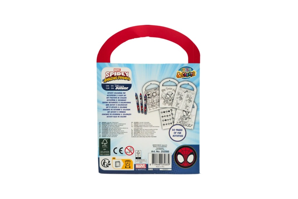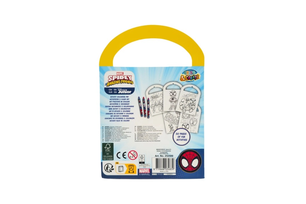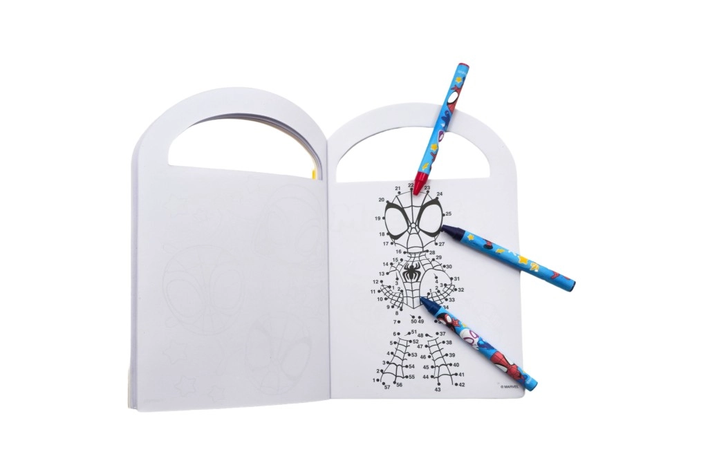 Otkrijte prijenosnu kreativnu bilježnicu s ručkom koja će zabaviti male obožavatelje SPIDEYJA i njegovih prijatelja kod kuće i na putu. Unutra ćete naći stranice za bojanje, spajalice (dot-to-dot) i jednostavne logičke aktivnosti s temom superjunaka.