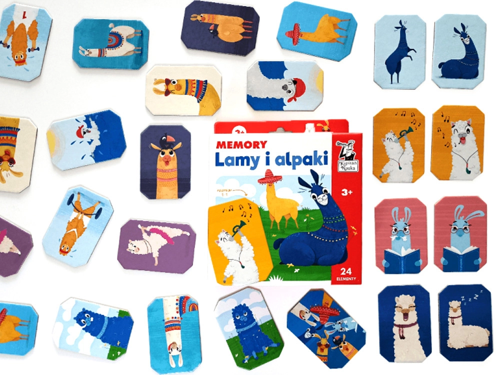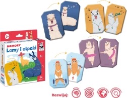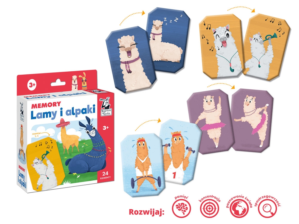 Zabavna memo igra s motivima prijateljskih lama i alpaka za djecu od 3 godine. Igra razvija pamćenje, pažnju i koncentraciju pri traženju parova. Pakiranje sadrži 24 kartice (12 parova) veličine oko 9 × 6 cm s veselim ilustracijama – balerina, glazbenik, pirat i drugi.