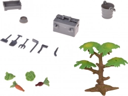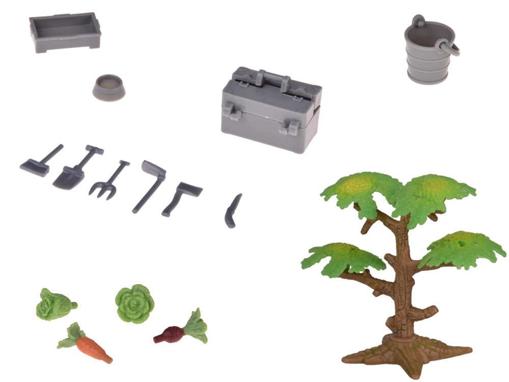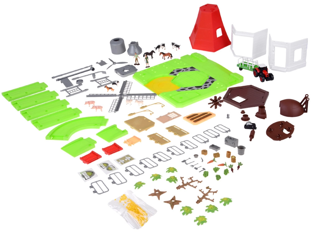 Sadržaj pakiranja uključuje traktor s prikolicom, figurice farmera i farmerice te bogat set životinja s farme (konji, krave, svinje, ovce, psi). Ne nedostaju alat, kanta, sanduci, hrana i drugi dodaci za realistične scene. Dijelovi su šareni, modularni i jednostavni za slaganje, pa potiču kreativnost, maštu i prostornu organizaciju.
