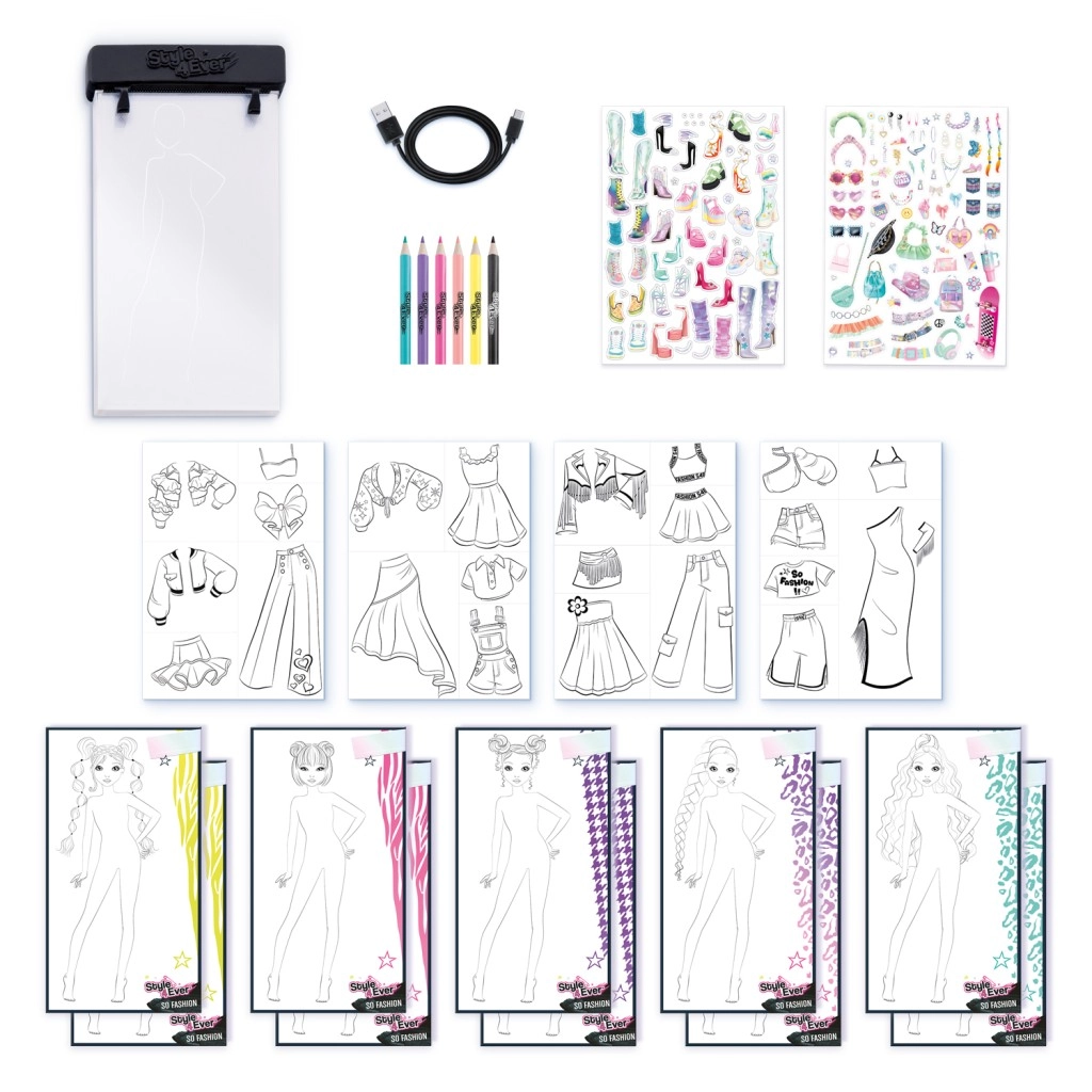 Otkrijte kreativni svijet mode uz Style4Ever – dizajnerski set s osvijetljenom podlogom koji djeci donosi sate stvaralačke zabave. Izrađujte vlastite modne skice pomoću šablona, modela, naljepnica i obojenih olovaka. U kompletu je USB‑C kabel za jednostavno punjenje. Prikladno za djecu od 6 godina.