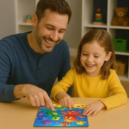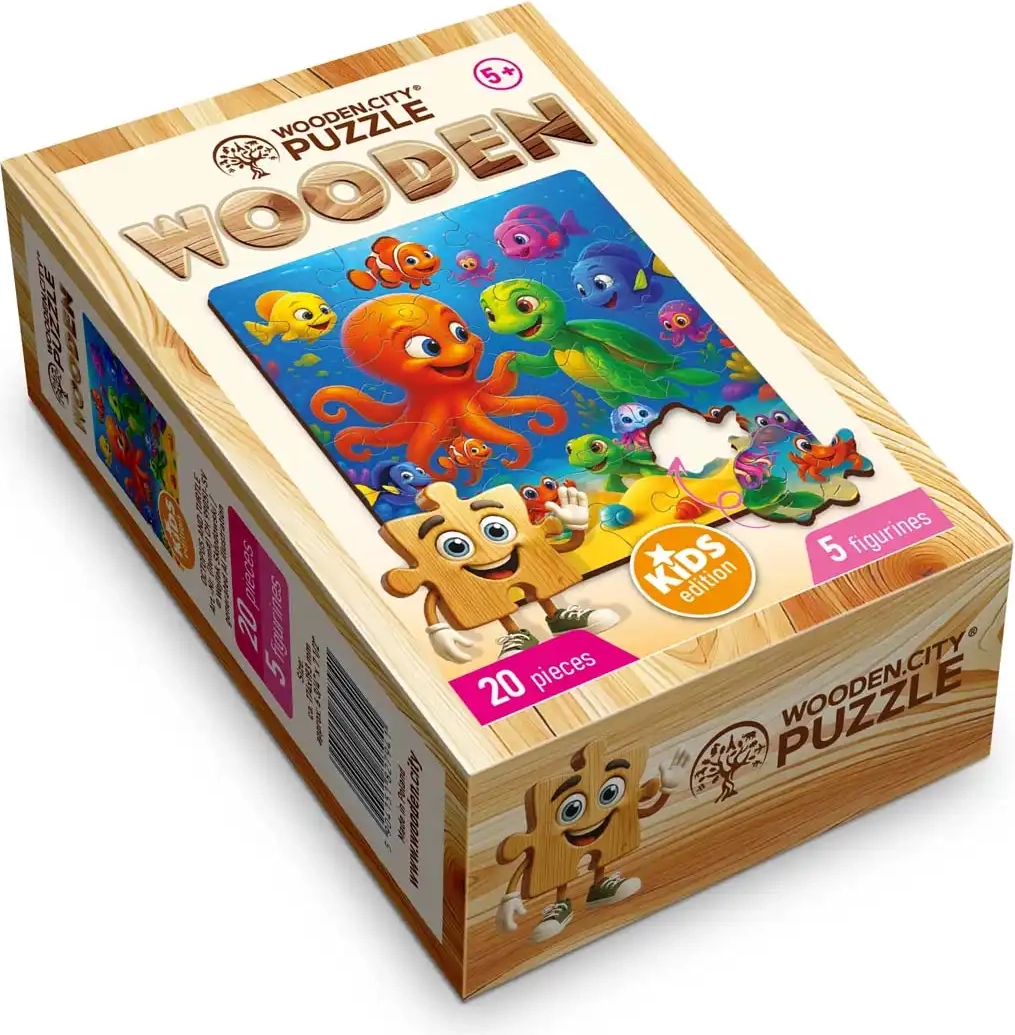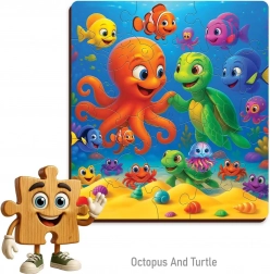 Drvene puzzle WOODEN CITY s motivom hobotnice i kornjače prenose djecu u fascinantni podmorski svijet. Svaki je dio izrađen s maksimalnom preciznošću kako bi savršeno pristajao, a rezultat je očaravajuća scena dimenzija cca 19,3 × 17,4 cm.