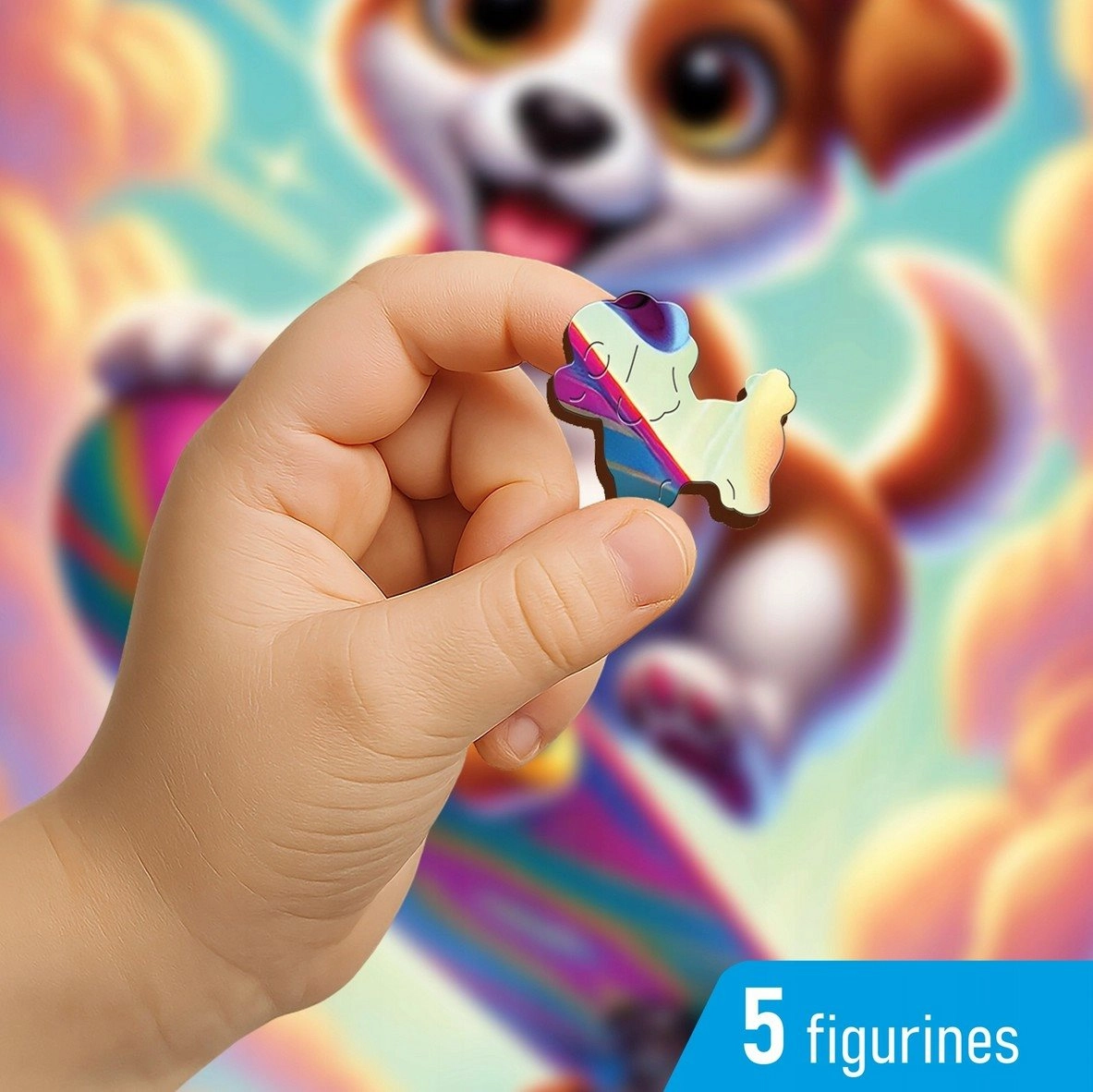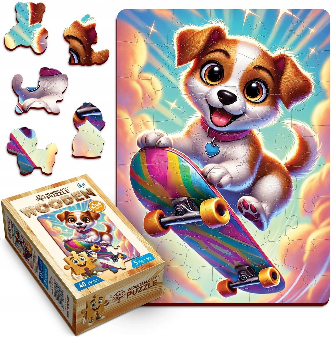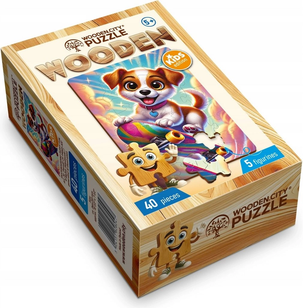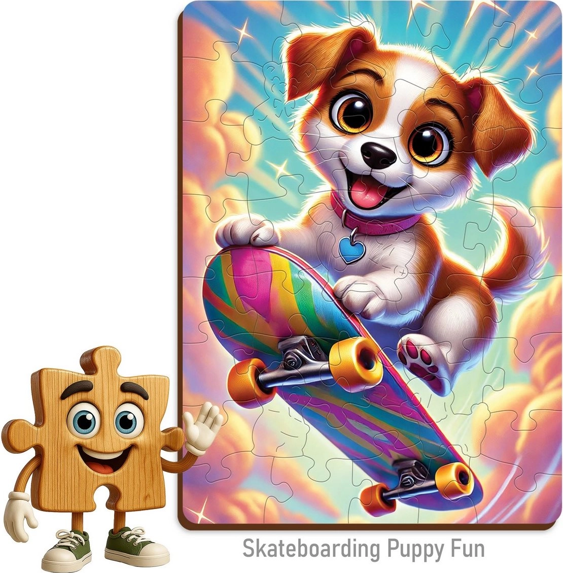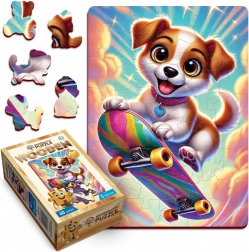 Drvene puzzle s motivom psića na skateboardu izvrstan su izbor za djecu koja vole kreativnu igru. Kvalitetan materijal i pažljiva izrada osiguravaju ugodno slaganje i dugi vijek trajanja. U pakiranju se nalazi i posebna predložak-kartica, koja djeci olakšava početak.