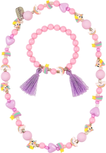 Slatki set nakita za male modne znalce od 3 godine uključuje perličastu ogrlicu s motivom jednoroga i duge te usklađenu elastičnu narukvicu. Nježna kombinacija ružičaste i svijetloljubičaste boje daje razigran izgled – idealno za proslave, fotografiranje i svakodnevno nošenje.