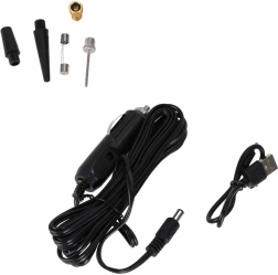 - električna pumpa/mini kompresor, crijevo, 5× izmjenjivi nastavak, USB kabel, kabel za upaljač u autu, upute