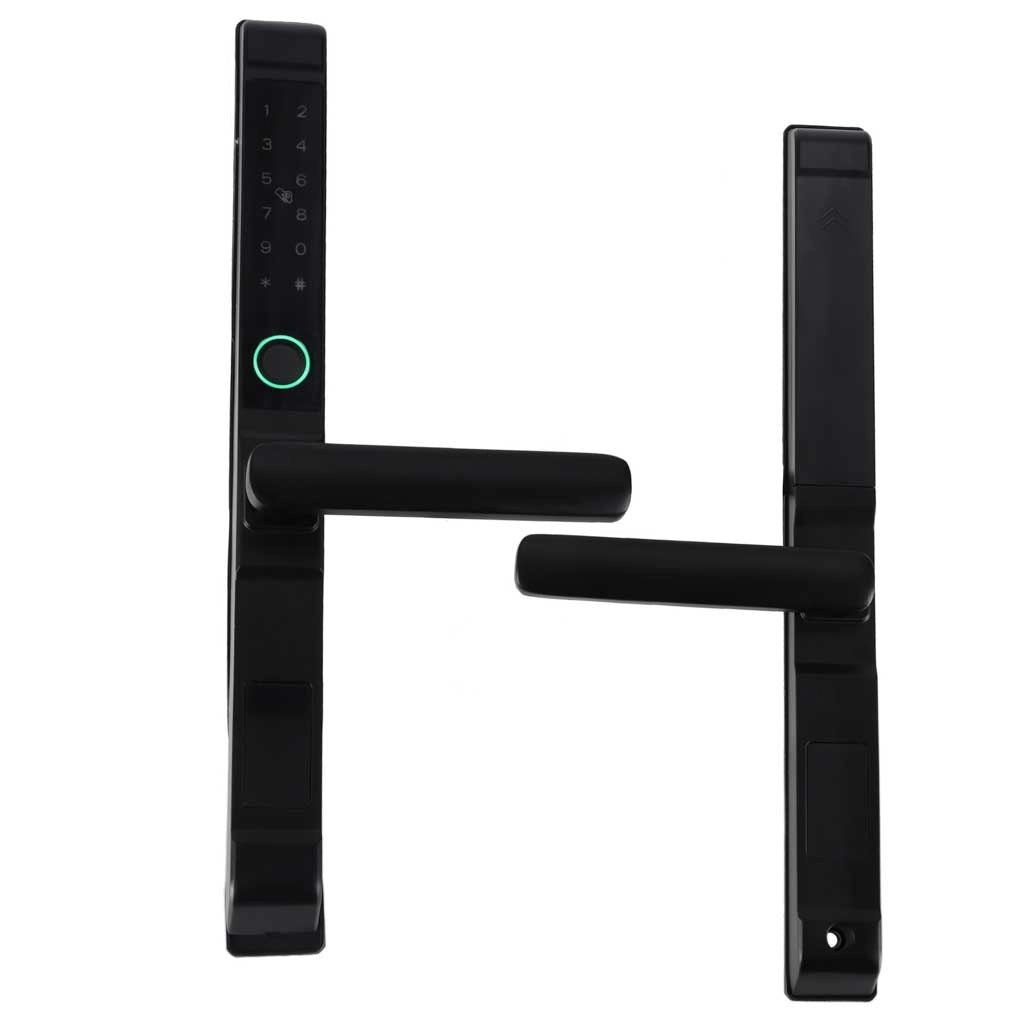 Moderna pametna brava za vrata s dodirnom tipkovnicom, čitačem otisaka prstiju i podrškom za MIFARE kartice nudi pristup bez ključa, upravljanje putem mobilne aplikacije i Wi‑Fi/Bluetooth povezivost. Zahvaljujući više metoda otključavanja, alarmu nakon pogrešnog koda i mogućnosti unosa nasumičnih brojeva prije/nakon lozinke pruža visoku razinu sigurnosti za stambena i ulazna vrata.