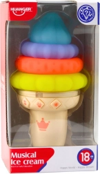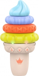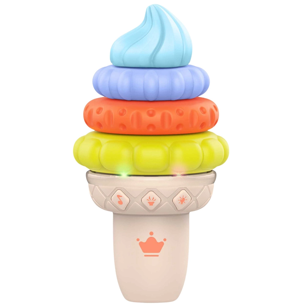 Ovaj glazbeni edukativni sladoled izvrstan je izbor za prvo otkrivanje svijeta kroz igru. Šareni, mekani i elastični dijelovi s različitim teksturama potiču hvatanje, stiskanje i slaganje u bilo kojem redoslijedu, čime podržavaju logičko razmišljanje i razvoj fine motorike. Ugrađene LED diode i ugodne melodije privlače pažnju djeteta i potiču osjetilnu stimulaciju.